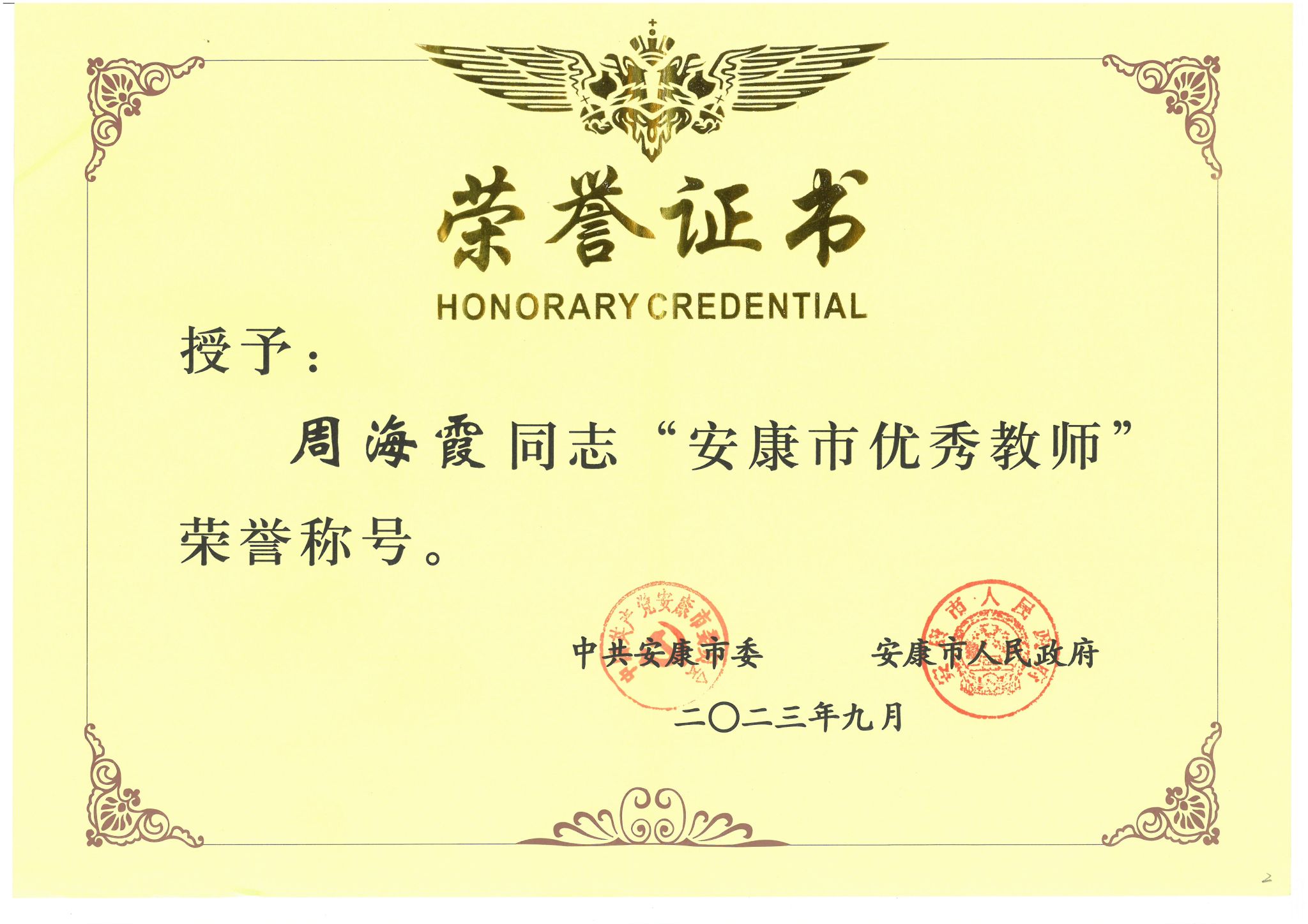 根据《关于推荐评选安康市教育工作先进集体和优秀教师、师德标兵、优秀班主任、先进教育工作者的通知》(安评组办发〔2023〕5号)精神和《1949伟德国际源自英国关于开展2023年校级教职工荣誉评选工作的通知》(党政办发〔2023〕16 号)相关要求,经个人申报、公司组织专家评审,公司教师周海霞被评为1949伟德国际源自英国优秀教师,同时被推荐参评安康市优秀教师,经安康市评审,确定周海霞为2023年安康市优秀教师。