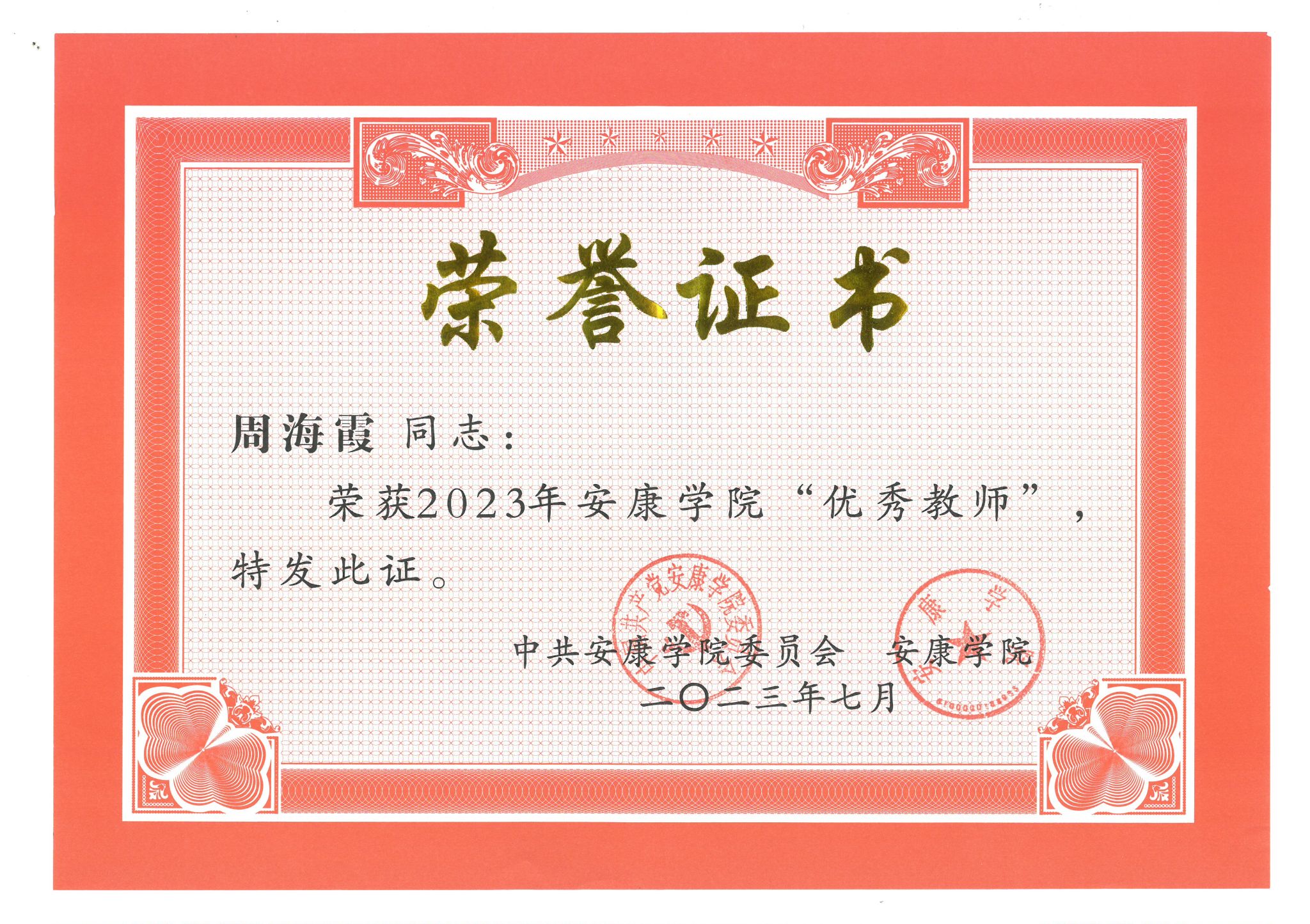 周海霞被评为1949伟德国际源自英国、安康市优秀教师,这是公司长期注重团队队伍教学科研能力提升和教师职业道德涵养的又一成果,同时也是对周海霞长期潜心课程建设、教学改革和教育育人工作的充分肯定。