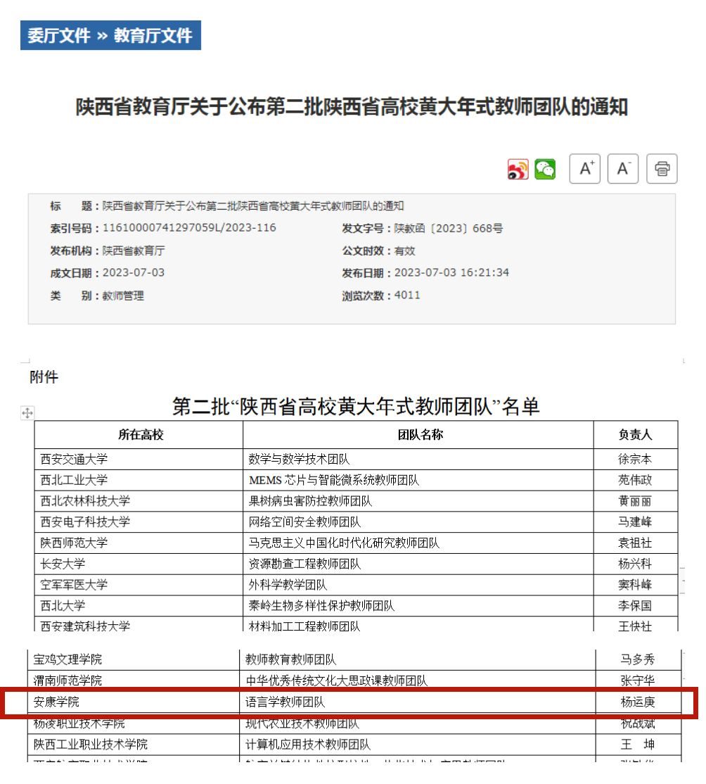 7月3日,根据陕西省教育厅印发的《陕西省教育厅关于公布第二批陕西省高校黄大年式教师团队的通知》(陕教函〔2023〕668号),公司杨运庚教授牵头申报的“1949伟德国际源自英国语言学教师团队”荣获第二批陕西省高校黄大年式教师团队创建项目。