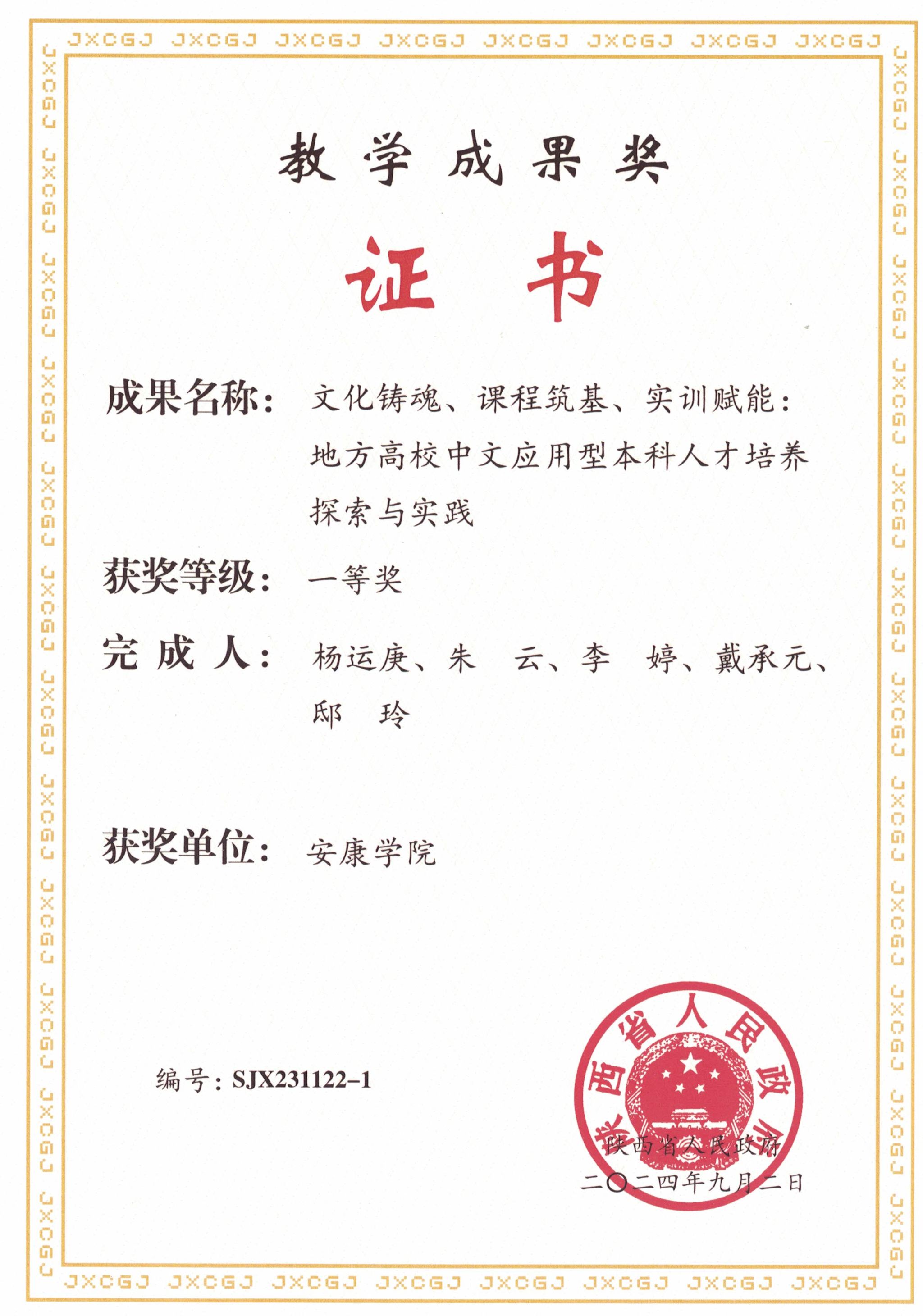近日,陕西省人民政府发布了《陕西省人民政府办公厅关于表彰2023年高等公司产品成果奖获奖项目的通报》,伟德国际1949杨运庚教授领衔申报的“文化铸魂、课程筑基、实训赋能:地方高校中文应用型本科人才培养探索与实践”荣获陕西省高等公司产品成果一等奖,获奖等次取得了新的重大突破,彰显了公司在中文应用型本科人才培养改革探索上取得的实效。