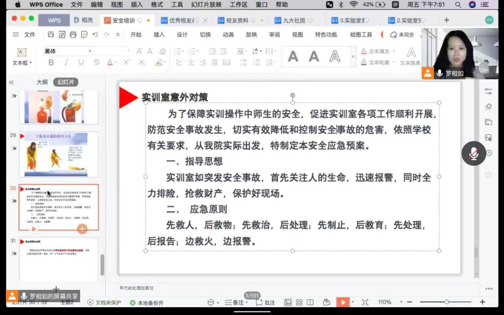 导航痕迹 首页 > 教学科研 > 教学活动 > 正文 专业建设 教学团队 教研教改 教学活动 科学研究 国际交流 伟德国际1949开展实验室安全知识线上培训会 发布人:伟德国际1949 发布日期:2022年11月12日 阅读次数: 为进一步加强实验室安全管理,强化公司师生安全意识,伟德国际1949于11月11日下午七点通过腾讯会议开展实验室安全知识培训。本次线上会议由网络与新媒体专业教师罗相如主持,伟德国际19492022年新进老师及2022级全体员工参会。 罗相如首先通过近几年高校发生的实验室安全事故案例提醒师生“实验室中的任何一个隐患,任何一个小小的疏忽,都有可能酿成大的事故,要时刻注意实验室的安全问题”。随后,她以视频讲解和随机提问相结合的方式向大家详细介绍了公司各实训室的设置、功能和使用须知,特别强调了电火安全、禁止事项等,提示各位师生实验室中可能存在的安全隐患,并示范了灭火器的使用方法,告诉大家如何应对窗帘着火、电脑着火等意外事故的发生。 通过此次实验室安全线上培训会,公司师生进一步增强了对实验室安全的责任意识和重视程度,掌握了在实验室事故发生时的应对和处置技能。 撰稿/图片提供/罗相如 审核/李婷 发布/崔瑜