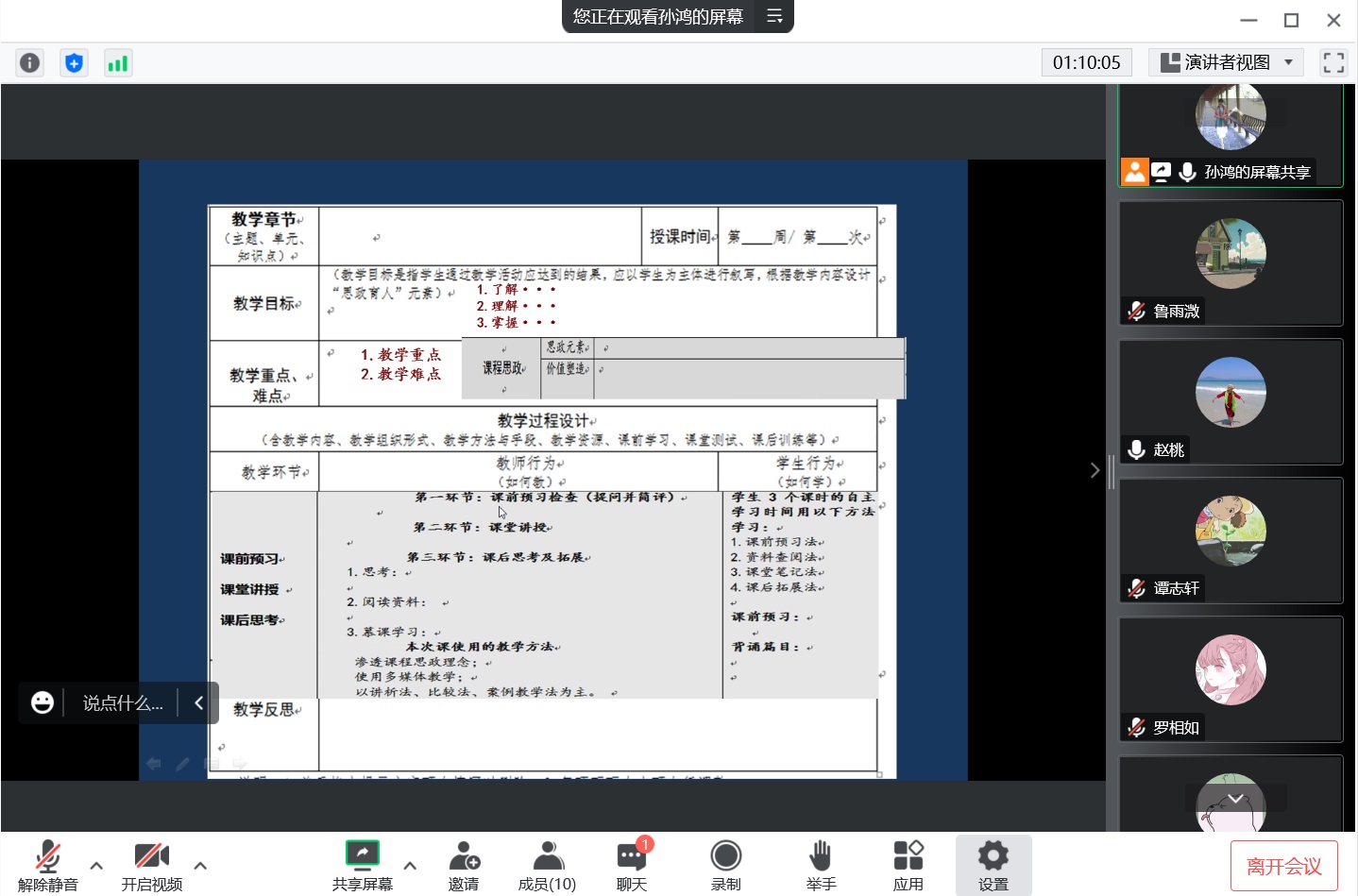 督导孙鸿、赵桃、周龙田、邸玲在对近两年入职的7名教师所承担的14门课程的教案进行了认真检查,对各位教师认真务实的工作态度进行了充分肯定,并在点评环节中对部分课程教案编写中存在的问题提出了改进建议。孙鸿就教案中教学设计的内容、自主学习环节的体现、教学资源的提供和使用等问题提出了指导性建议。赵桃强调教学大纲在教案编写中的重要性,从新进教师重视学习和参照大纲,合理构建课程架构、设置教学内容等方面进行了具体指导。周龙田就教学重点难点的设置及二者间关系的处理等问题提出了指导性意见,并希望新教师在教学内容的设计中体现一定的学术性。邸玲就教案中课程目标、教学设计、教学反思等环节中存在的不足提出了整改意见。随后,孙鸿详细讲解了新版教案的写作要点和格式规范,强调了渗透课程思政理念的重要性,同时对部分教案的修改提出了具体要求。