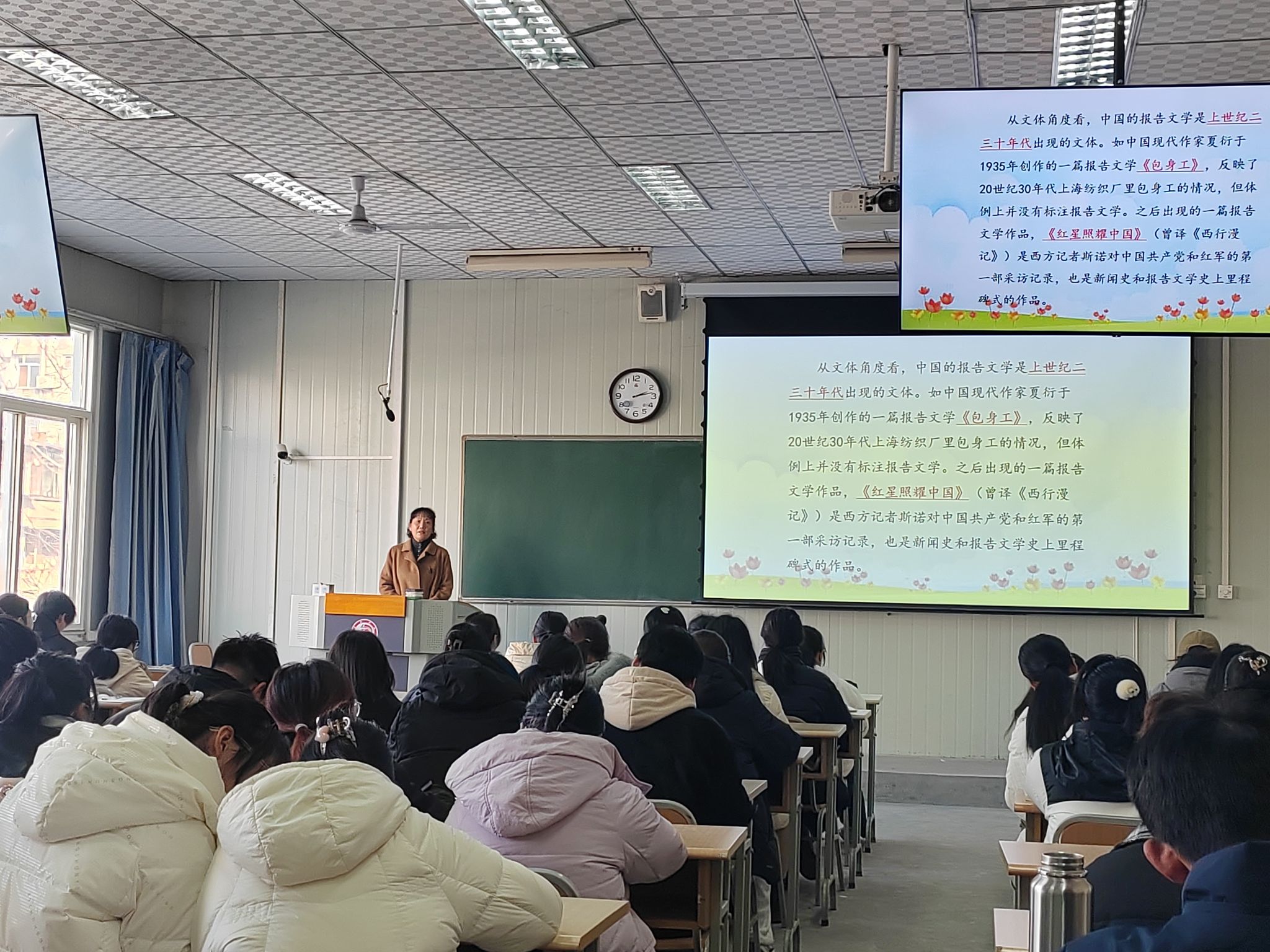 应伟德国际1949邀请,作家李春芝于1月4日下午在江南1026为汉语言文学2023级1、2班员工讲授报告文学的写作。