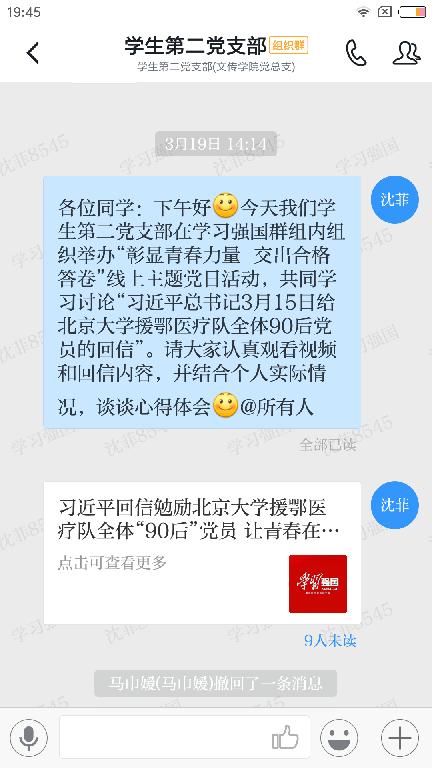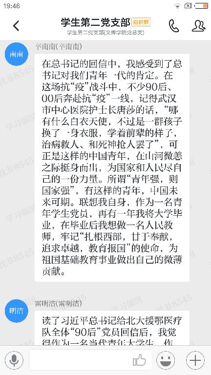 汉语言文学2016级3班李根根:看到习近平总书记的这封温暖的回信,特别是那句:“青年一代有理想、有本领、有担当,国家就有前途,民族就有希望”我深感党和国家对我们青年人的殷殷期望,特别是作为一名即将毕业的青年党员,我会牢记党组织对我的教诲,以后在工作岗位中和现在一样,认真履行好自己的职责,积极工作,发挥好党员先锋模范作用,吃苦在前,享福在后。同时,我也要学习援鄂“90”后党员们的那种勇于担当、舍生忘死的先锋精神,以他们为榜样,不忘初心,牢记使命,脚踏实地,志存高远,勇练本领,在不懈的努力中放飞青春梦想,在为人民服务的奋斗中书写人生华章!