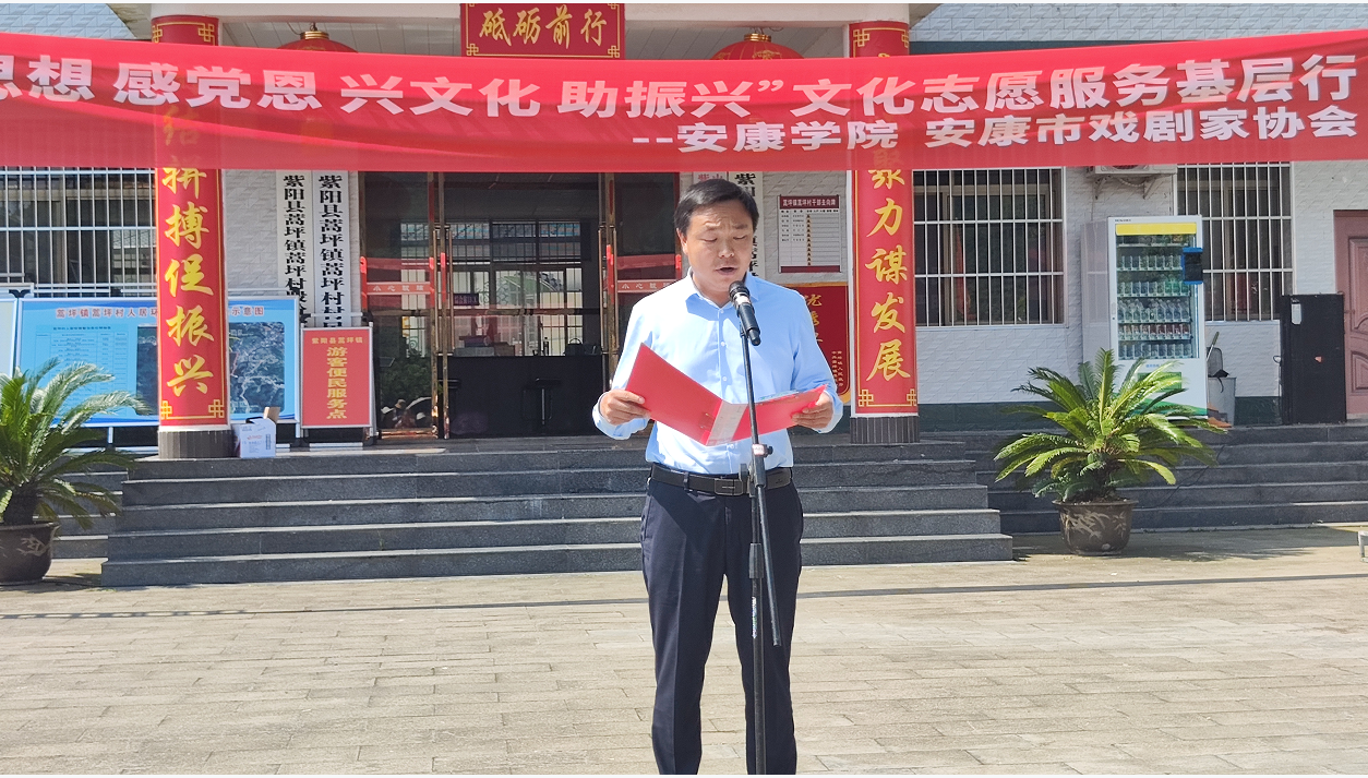 活动伊始,紫阳县蒿坪镇镇长袁超代表镇政府对公司文化志愿服务行活动表示热烈欢迎,介绍了蒿坪镇基本情况、文化建设、支柱产业和乡村振兴特色发展思路。经理杨运庚代表​伟德国际1949对蒿坪镇政府的大力支持表示了感谢,介绍了​伟德国际1949教学科研以及在地方文化研究方面取得的成绩,重点说明了本次活动的主要目的、内容和形式。安康市戏剧协会作为本次活动的联合承办单位,向公司、镇政府表示了感谢。