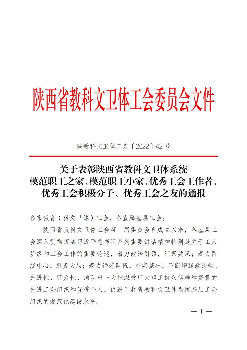 近日,陕西省教科文卫体工会委员会印发《关于表彰陕西省教科文卫体系统模范职工之家、模范职工小家、优秀工会工作者、优秀工会积极分子、优秀工会之友的通报》,工会伟德国际1949分会被授予陕西省教科文卫体系统模范职工小家称号。
