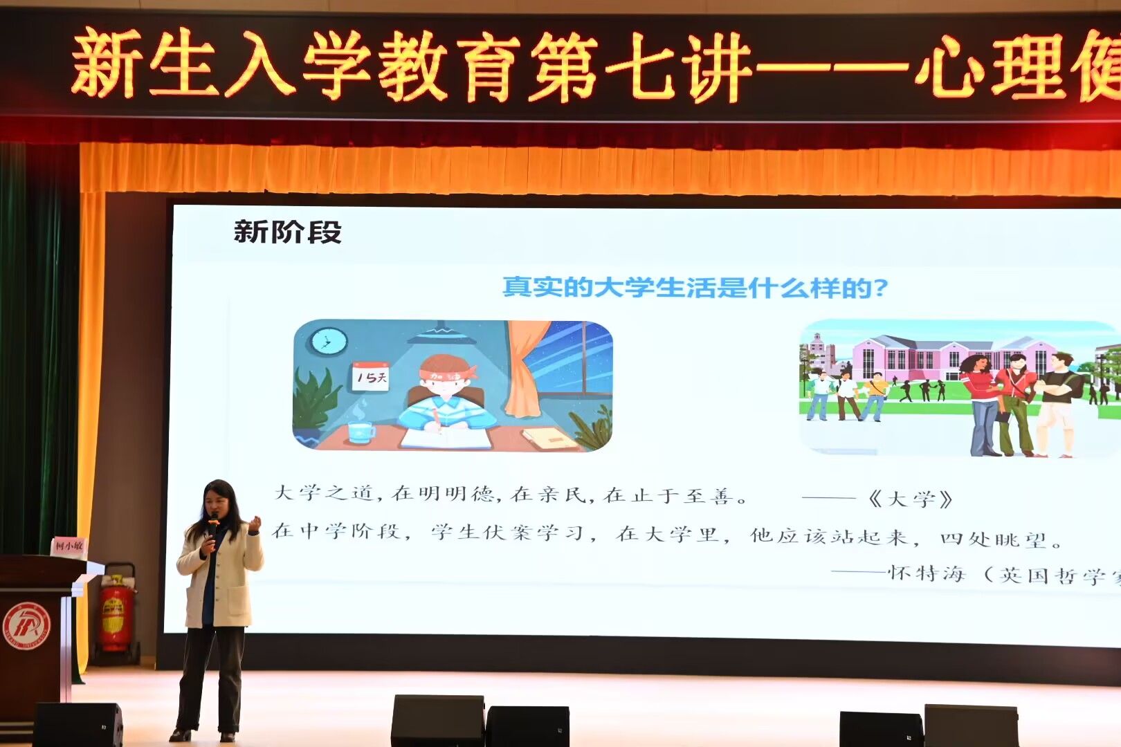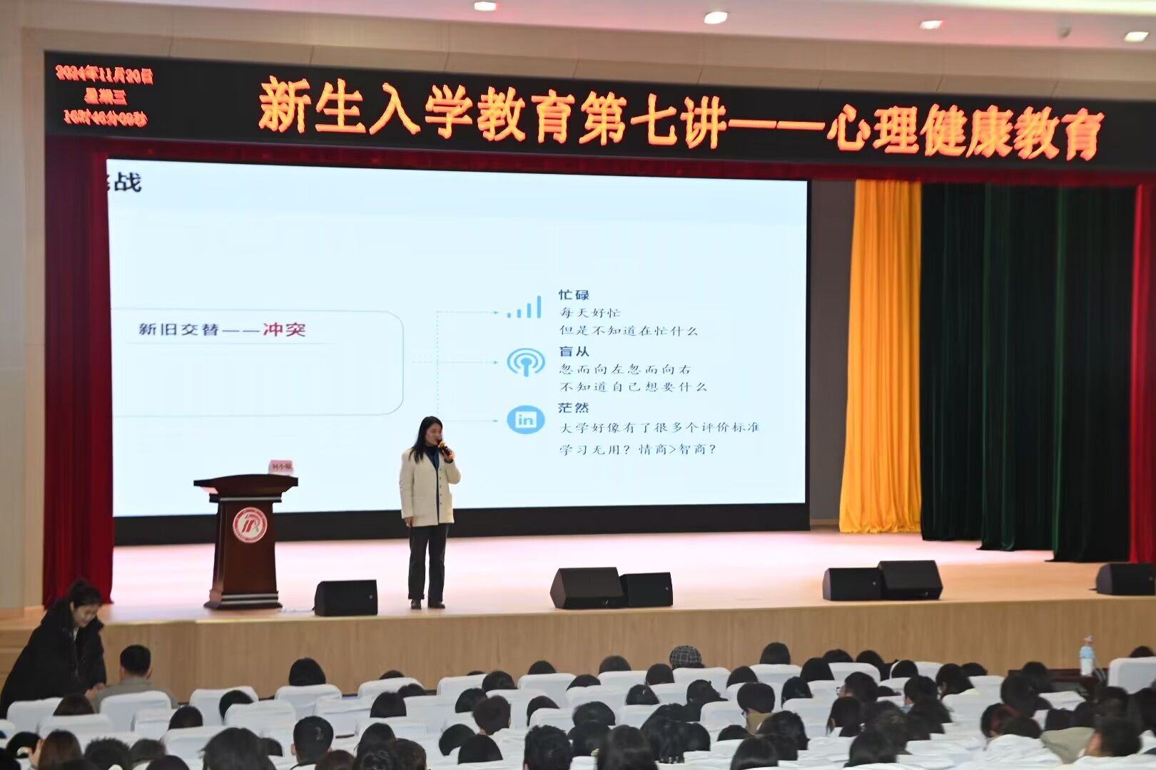 为进一步提升老员工心理健康素质,帮助同学们更好的应对挫折与挑战,11月20日下午,伟德国际1949在江南校区大礼堂开展了老员工心理健康教育专题讲座,特邀老员工心理健康教育中心主任柯小敏主讲。2024级全体新生参加活动,讲座由辅导员刘言军主持。
