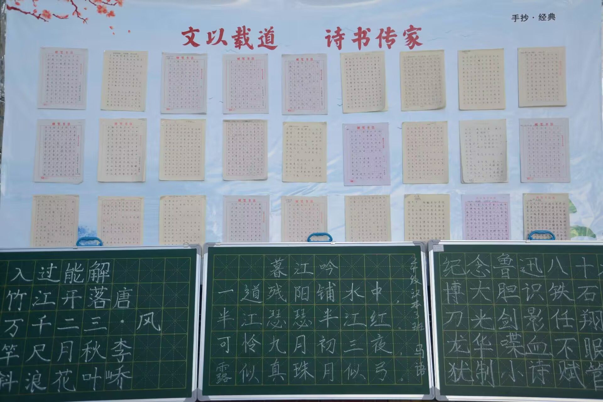 校园林荫道旁,粉笔字展示区的七言诗抄写精彩纷呈,有的字体刚劲有力,如颜筋柳骨般气势恢宏,将七言诗的磅礴意境表现得淋漓尽致;有的则灵动飘逸,仿佛每一个笔画都随着诗句的韵律在黑板上翩翩起舞。无论是李白的豪放洒脱,还是杜甫的沉郁顿挫,都在员工们的粉笔字中得以生动呈现,引得过往师生纷纷驻足欣赏。