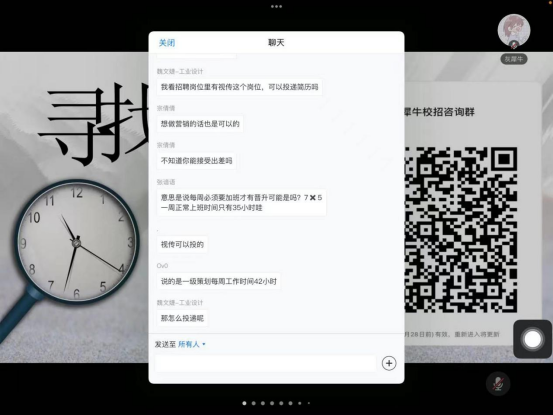 本次参加线上招聘会议人数超过250人,参会毕业生认真听取了灰犀牛图书策划有限公司HR的公司简介,了解了薪资福利等信息,对该企业表现出了极大的兴趣。许多参会毕业生通过视频语音的方式,积极与企业方沟通,取得了良好的效果。会后,有求职意向毕业生纷纷添加企业微信群,进行进一步的求职沟通。