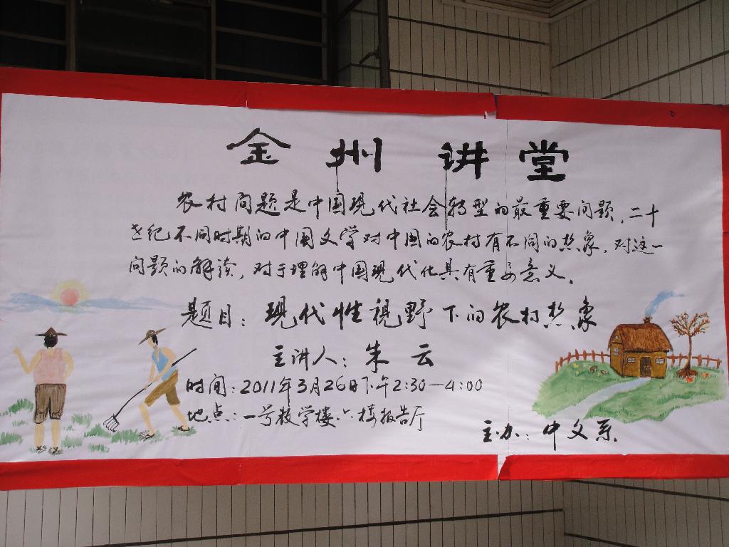 导航痕迹 首页 > 新闻通知 > 伟德国际1949新闻 > 正文 伟德国际1949新闻 通知公告 中文系教师朱云主讲“金州讲堂”第五讲 发布人: 发布日期:2011年03月28日 阅读次数: 2011年3月26日14:30分,中文系朱云老师为“金州讲堂”在一号楼六楼报告厅为广大师生做题目为“现代性视野下的农村想象”专题讲座。 朱老师首先就“想象”和“现代性”做出不同的解释,提出没有想象就没有文学,并将进步的现代性和审美的现代性结合,提倡去自然界寻求精神家园。其次,朱老师结合卡林内斯库的两种“现代性”提出现代性农村想象的两条线索,即 “进步的现代性思路”“审美的现代性思路”,将科学理性和美好的人性结合,推进中国的现代化。最后,朱老师说中国的农村是一个复杂的存在,从现代性的解读只能考察一部分作品,任何一部作品对农村的描绘都是一种想象,都是有选择的,并激励在座的同学们认真学习专业知识,从不同的角度认识剖析现代农村所积淀的深刻韵味。 在讲座结束时,中文系副主任雷升录老师进一步总结,强调在现代社会资本源源不断输入的情况下,在新的价值尺度背景中,农村文学的发展面临着残酷而严峻的形式,这一问题给在场的每位同学带来了一个新的思考空间。