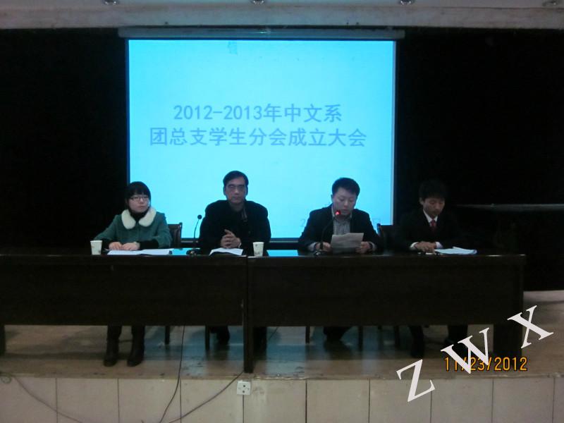 2012年11月23日晚8点,1949伟德国际源自英国中文系2012-2013学年度团总支员工分会成立大会在一号楼六楼报告厅正式举行。到会的有中文系党总支书记李岩、团总支书记沈菲;2011-2012学年度团总支员工分会主席团及各部部长、2012-2013学年度团总支员工分会主席团、各部部长及全体干事。成立大会在全体到会人员合唱国歌的旋律中拉开序幕。