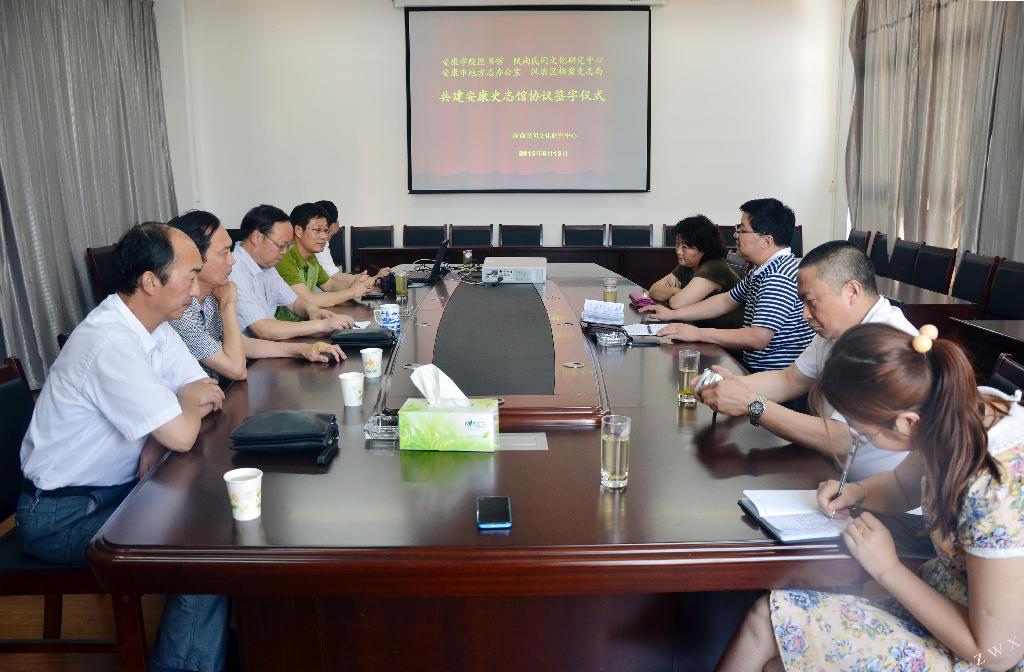 2013年6月13日,1949伟德国际源自英国图书馆、陕南民间文化研究中心、安康市地方志办公室、汉滨区档案史志局四单位就联合共建安康方志馆有关事宜的协商洽谈与合作协议签字仪式在陕南民间文化研究中心会议室举行。1949伟德国际源自英国图书馆馆长何道利、1949伟德国际源自英国中文系主任兼陕南民间文化研究中心主任戴承元、安康市地方志办公室原主任张永强、现任主任柯晓明、副主任蔡晓林、1949伟德国际源自英国中文系副主任杨运庚、汉滨区档案史志局局长姚舜杰等11人参加了协商洽谈会与签字仪式,协商洽谈会与签字仪式由陕南民间文化研究中心主任戴承元主持。