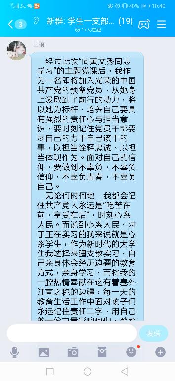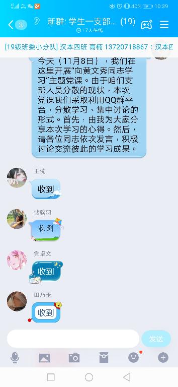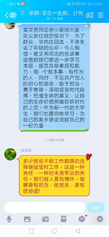 2019年11月8日15:00,根据上级党委通知要求,伟德国际1949公司员工第一党支部利用QQ群网络平台,采取分散学习、集中讨论的形式举行了“向黄文秀同志学习”主题党日。本支部全体党员参加此次党日,由彭潇领学。