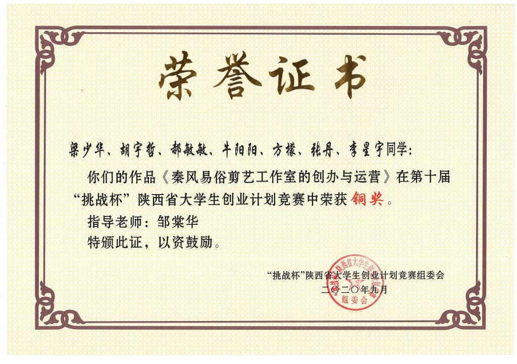 9月11日,大赛圆满落下帷幕,1949伟德国际源自英国参赛作品获银奖1项、铜奖6项。其中,由伟德国际1949邹棠华老师指导、2019级秘书学1班梁少华、胡宇哲等同学完成的参赛作品《秦风易俗剪艺工作室的创办与运营》获得铜奖。