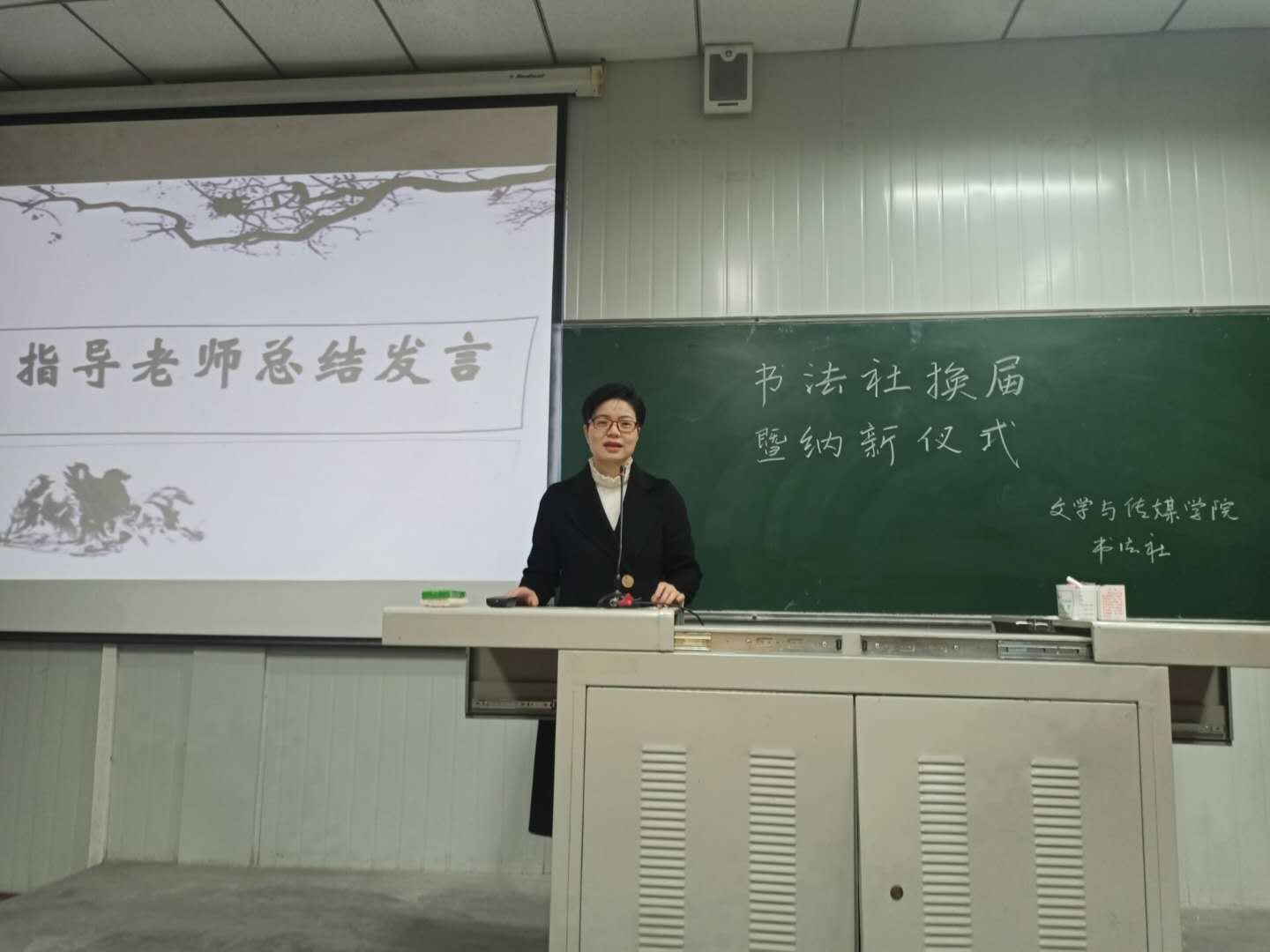 大会在主持人精彩的开场白后,拉开帷幕。首先周海霞老师做了精彩的讲话,从书法社的建设初衷,历届社员的成绩,以及书法的重要性等多方面做了详细的阐释,让大家更清楚的感受书法的魅力。除此之外,周海霞老师对新社员提出了殷切期盼,鼓励大家积极参加社团活动,勤于练习。前任社长阙汉民发言对上一届社员整体学习情况做了基本总结,同时就练习书法的具体问题提出意见。