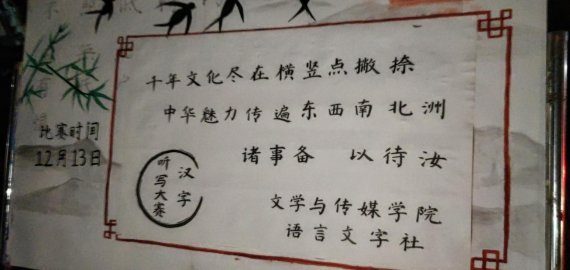 我们中国的汉字,落笔成画留下五千年的历史。为传承语言文化,展现汉字魅力,伟德国际1949隶属的语言文字社于江南校区举办了以“千年文化尽在横竖点撇捺,中华魅力传遍东西南北洲”为主题的汉字听写大赛活动。