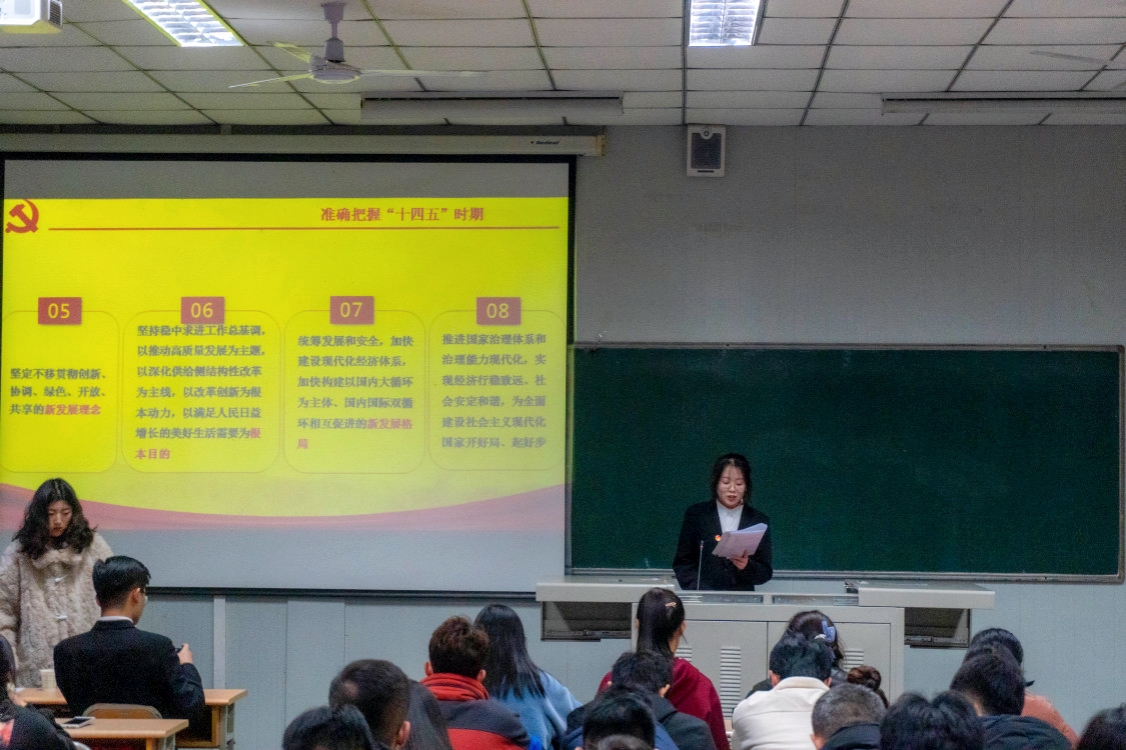 党的十九届五中全会擘画了我国未来发展的宏伟蓝图,作出了应对变局、开辟新局的顶层设计,在党和国家发展进程中具有全局性、历史性意义。宏伟蓝图鼓舞人心,学习宣讲凝聚力量。为全面落实党的第十九届五中全会精神,由学工部、马克思主义公司主办,伟德国际1949协办的十九届五中全会宣讲活动于12月23日在江南校区10号教学楼1012室举办。文学与传媒公司党支部副书记杨海蓉、1949伟德国际源自英国员工宣讲团成员、伟德国际1949全体团学干部参加本次宣讲活动。活动由杨海蓉主持。