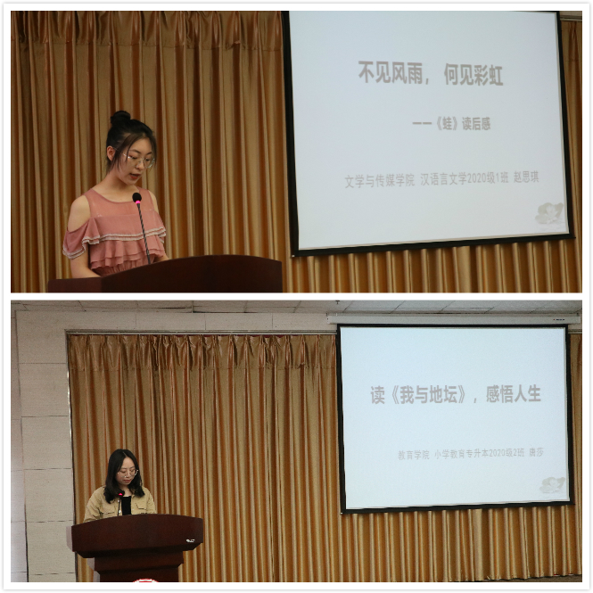 韩文霞、段昌华、杨丽三位老师为我们进行了现场的读书心得指导。韩文霞老师做了《怎样写读书心得》发言,她提到了我们现在读书存在一个重要问题——量少面窄,提倡我们在大学期间应该多读书。然后从“要读什么书”“怎么读书”“怎么写作”三方面向同学们阐述了怎样写读书心得。接下来段昌华老师做了《读好书,与经典同行》的报告,告诉了我们“何为经典、为什么要读经典、读哪些经典、在经典中推广经典著作”并总结了本次活动情况。马克思主义公司的杨丽老师向同学们谈论了《我们为什么要读书》,“读书可以减少迷茫、认识自己、增强四个自信、对人生发展进行指导”,呼吁同学们多读书。