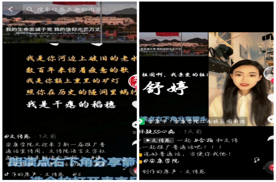 除了一系列线下的推普活动,语言文字社还紧随时代潮流,利用当下流行的抖音合拍功能,进行了普通话的推广。通过剪辑视频发送至伟德国际1949官方抖音,号召全校师生进行合拍朗诵,达到推广普通话的目的。视频一经发出,就受到了广泛的关注,同学们也积极进行了线上朗诵合拍。