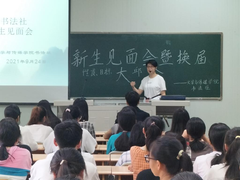 彰显笔墨风采,传承书香文化。伟德国际1949书法社于2021年9月24日16:40在1028教室成功举办了第八届换届暨纳新仪式见面会。参加见面会的有书法社指导老师周海霞老师,前任社长王思蓉,现任社长马子涵以及103位社团成员。