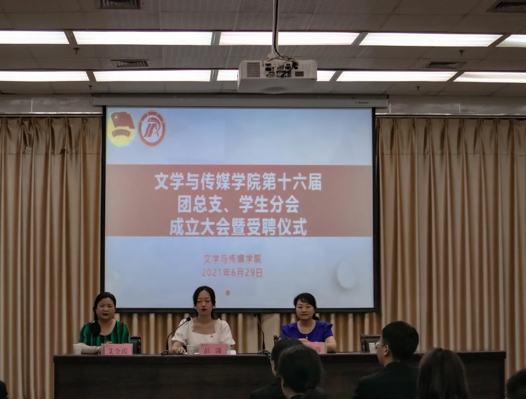 6月29日晚19:00,伟德国际1949在图书馆6楼报告厅召开第十六届团总支员工分会成立大会暨聘任仪式。文学与传媒公司党总支副书记杨海蓉、团总支书记彭潇、学工办副主任薛涛、辅导员艾全霞出席会议。会议由第15届员工分会主席团成员于家彬主持。