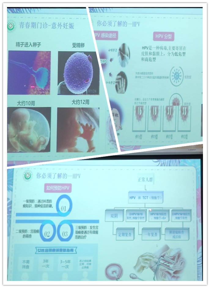 主讲人黄欢从识别选择医疗结构、女性生理周期、青春期门诊、人流的危害、关于HPV等五个方面向现场同学做了详细清晰的青春期女性生理知识普及。她用真实案例提醒同学们注重生理健康,求医问诊需谨慎,甄别选择正规的医疗机构就诊,不能一味追求快捷方便而耽误病情。其次,女生要注意记录生理周期,一旦出现不适和反常现象,不要拖延及时就诊,注意作息规律,健康饮食,减少熬夜,合理锻炼,不盲目减肥,力减患癌风险。第三,年轻女性要正确处理与异性的关系,学会保护自身安全,尽量减少或避免对身体伤害性极大的人流等易造成并发症的身体伤害。接着,她用身边的真实案例,讲述HPV对身体的伤害,系统讲解了HPV在体内各个阶段出现的病发状态,对我们提出预警,告诉女性可以通过定期检查和注射疫苗来积极防御宫颈癌,珍爱健康,珍爱生命。