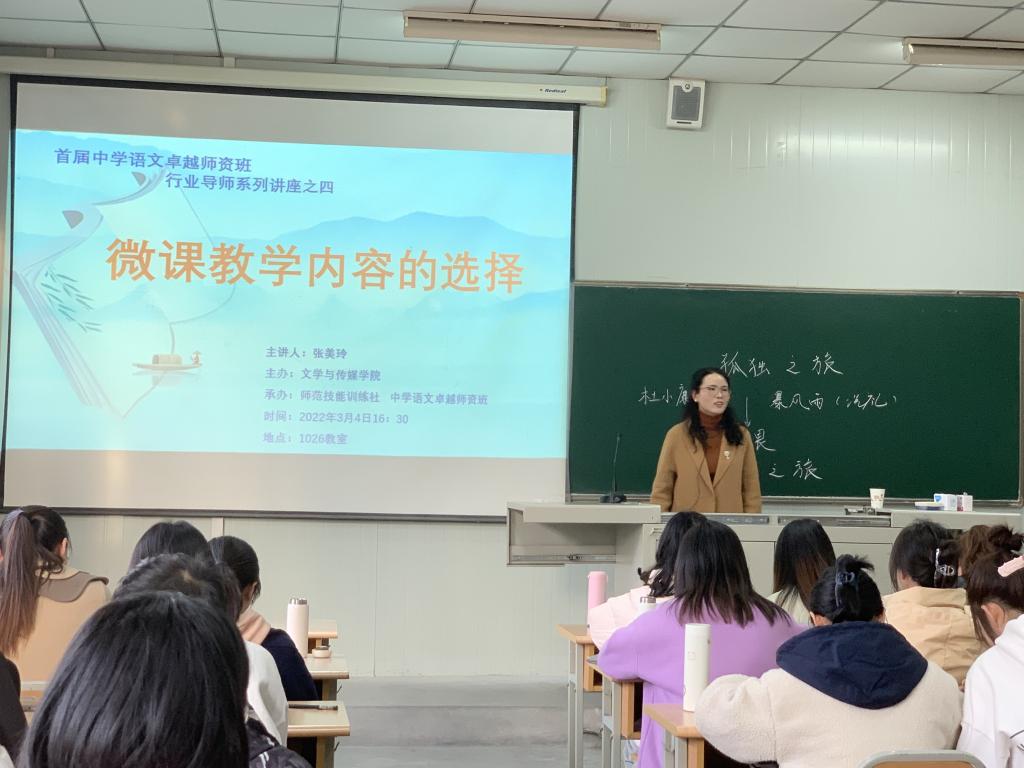 新学期伊始,按照“中学语文卓越团队班”人才培养计划方案,34日下午4点,公司特邀安康市汉滨初级中学优秀教师,陕西省语文教学能手张美玲老师在1026教室开展了题为微课教学内容的选择的专题讲座活动,活动由中学语文卓越团队班班主任张格瑄老师主持。