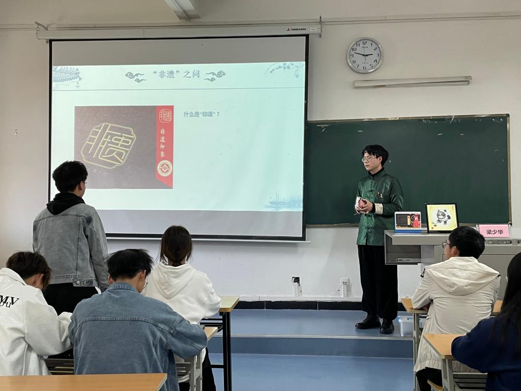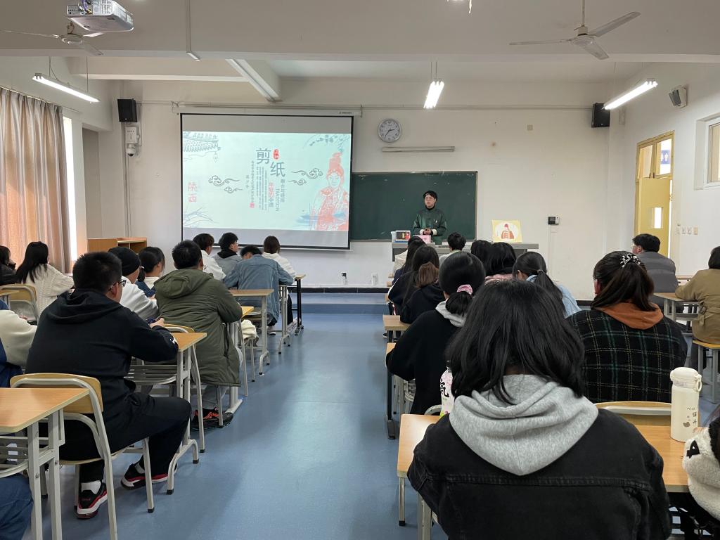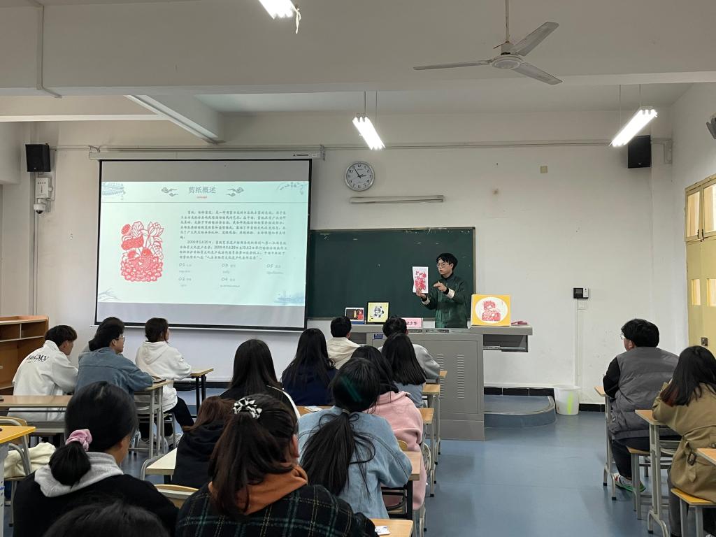 “当非遗走进年轻人时,传统就有了延续的希望;当年轻人走近非遗时,成长将获得文化的滋养。剪纸艺术有了年轻人的传承才能与时代碰撞融合。”梁少华首先向同学们介绍了剪纸文化的发展历史,从先唐中国剪纸的雏形,到唐朝剪纸艺术进一步发展,到明清时期剪纸艺术日趋成熟,近现代的剪纸艺术愈加多样精细。现场通过展示自己的剪纸作品为同学们介绍了剪纸的分类:题材、形式、内容、用途。栩栩如生的戏曲人物、活灵活现的孙悟空、乖巧可爱的冰墩墩都令同学们深为叹服。