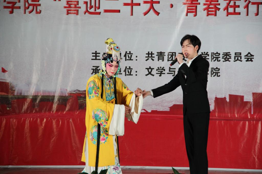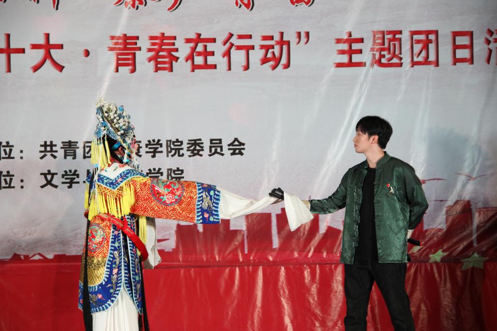 在秦声的悠悠乐曲中,演出大幕缓缓开启。上半场,热耳酸心的秦腔《黑叮本·二进宫》、《五典坡·探窑》、《五典坡·赶坡》轮番上演,一个个精美的造型令在场的师生眼前一亮,一步一景一画卷,一曲一舞一光影。由王铮、刘芳、焦钰、李月婷带来的舞蹈《旧梦惊尘》、《探窗》灵动的将上半场串联起来,恍如穿越。