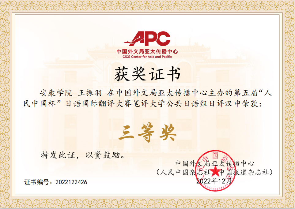 导航痕迹 首页 > 新闻通知 > 伟德国际1949新闻 > 正文 伟德国际1949新闻 通知公告 公司学子获第五届人民中国杯日语国际翻译大赛三等奖 发布人: 发布日期:2022年12月15日 阅读次数: 近日,第五届“人民中国杯”日语国际翻译大赛于落下帷幕,公司2020级汉语言文学专业王振羽同学在本次赛事中荣获大学公共日语组(笔译日译汉)三等奖。 第五届“人民中国杯”日语国际翻译大赛由中国外文局亚太传播中心(人民中国杂志社、中国报道杂志社)主办、中国日语教学研究会、中国日语教学研究会华南分会及广东外语外贸大学东方学研究院协办,吸引了中国和日本700多所高校和企事业单位的近万名选手积极参与。本次人民中国杯国际翻译大赛设置了翻译家组、研究生组、大学公共日语组、本科组、中学组、高职高专组、社会组共七个比赛类别,比赛项目分为笔译、口译两大项目。 该赛事级别高、影响广、规模大。王振羽同学在该赛事笔译项目中斩获奖项,是公司学子语言文字技能应用能力的体现,也是公司学子综合素质全面发展的表现。伟德国际1949历来重视员工综合素质的全面发展,鼓励员工积极参加各类有权威性的比赛。据悉,公司将会持续加强对员工参加各类高水平比赛的支持、指导力度,达到以赛代练、以赛促学的良好成效。 文稿、图片/王振羽 审核/杨海蓉 发布/薛涛