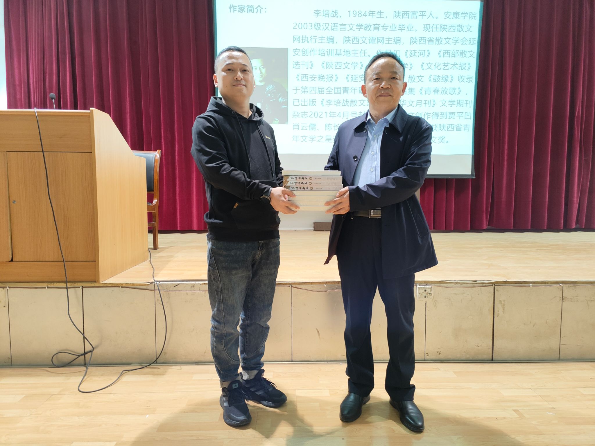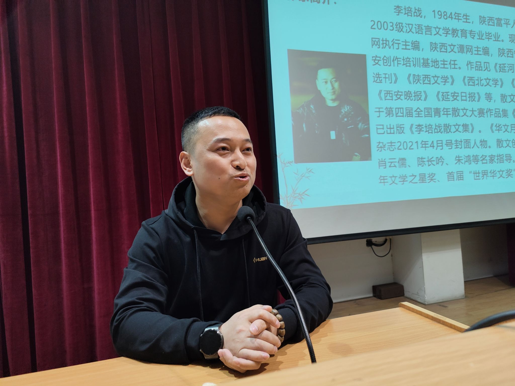 为充分发挥员工榜样力量,聚合员工资源强化育人,2023年4月12日下午,伟德国际1949邀请汉语言文学专业2006届员工、现任陕西散文网执行主编、陕西文谭网主编、陕西省散文学会延安创作培训基地主任李培战在一号教学楼六楼报告厅举办文学创作报告会。伟德国际1949经理杨运庚、党总支副书记杨海蓉、辅导员邹棠华,影视戏剧社、文学创作社、风华诗社共计二百余人到场聆听。本次报告会由杨海蓉主持。