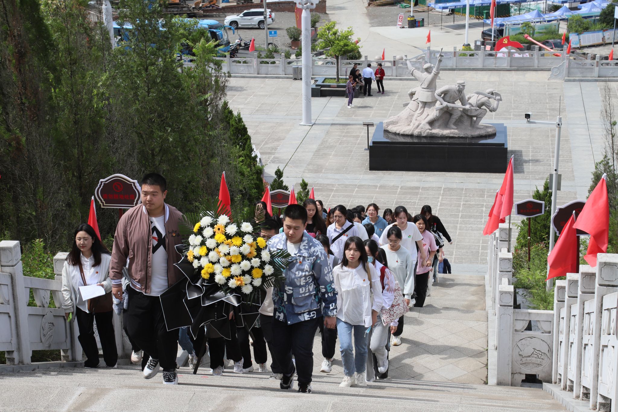 为深入学习习近平新时代中国特色社会主义思想,贯彻落实党的二十大精神,培育青年学子爱国主义情怀,让红色基因世代赓续,2023年5月24日,公司团总支带领秘书学2021级1班团支部、汉语言文学专业2022级4班团支部部分同学前往牛蹄岭战斗纪念碑开展“永远跟党走,建功新时代”主题团日活动。文学与传媒公司党总支副书记杨海蓉、员工第一党支部书记李欣逸、员工第二党支部书记薛涛、团总支书记彭潇以及辅导员邹棠华参加了此次主题团日活动。