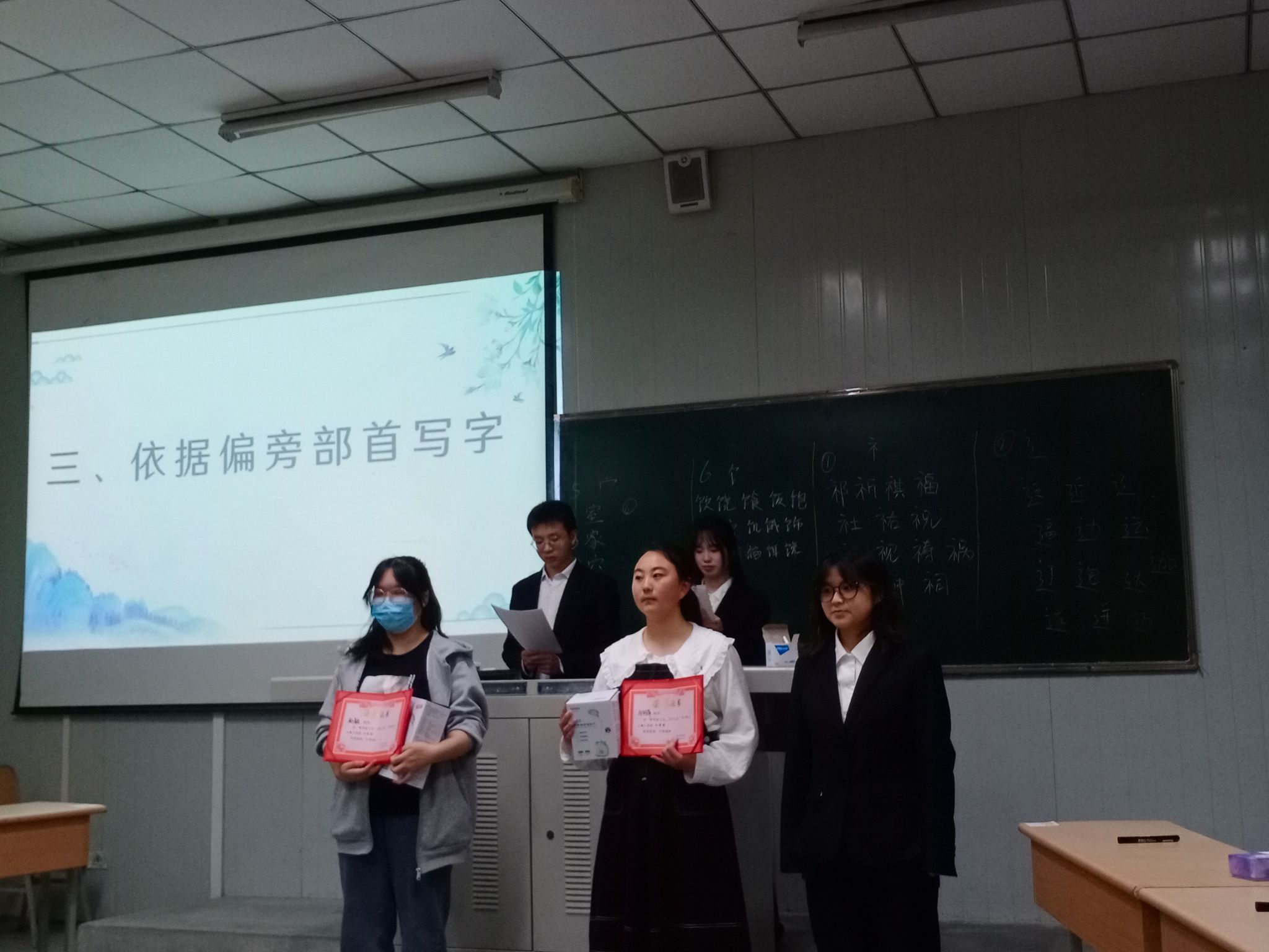 最终获奖的同学有:一等奖鲁炎玲;二等奖牛向萍、赵颖;三等奖刘宗双、祁思甜、李史强,由社团社长为获奖同学颁发获奖证书。观众以热烈的掌声祝贺获奖同学。