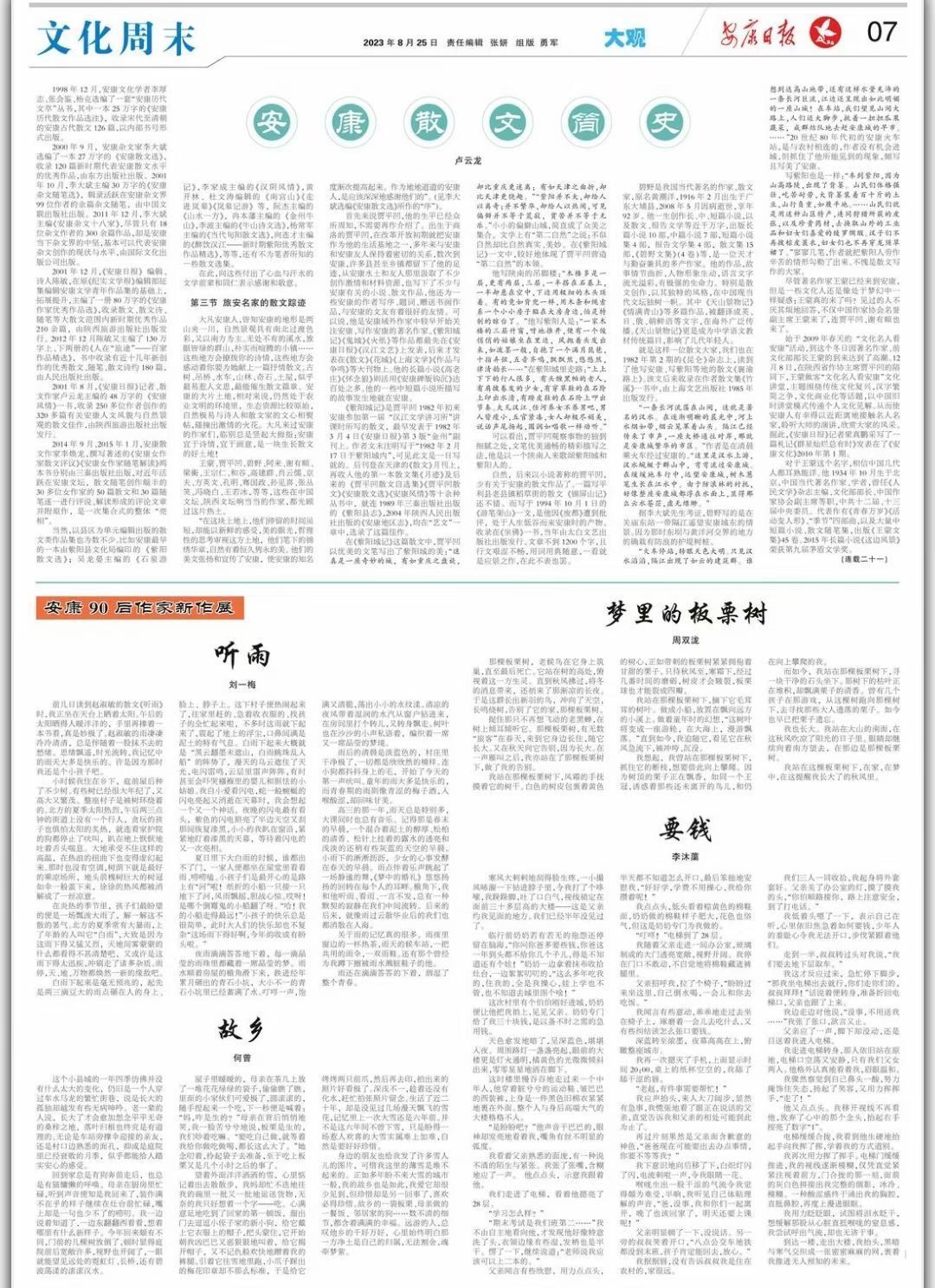 导航痕迹 首页 > 新闻通知 > 伟德国际1949新闻 > 正文 伟德国际1949新闻 通知公告 心怀文学梦,执笔写风华 发布人:伟德国际1949 发布日期:2023年09月01日 阅读次数: 2023年8月25日,伟德国际1949四位学子的文学作品在《安康日报》刊登,作者及作品为周双泷《梦里的板栗树》、刘一梅《听雨》、李沐蕖《要钱》、何曾《故乡》。 为培养“能说、会写、善教”实践能力突出的专业人才,伟德国际1949持续提高员工的学科素养能力,突出汉语言文学专业的特色与优势,注重对员工写作能力的濡染熏陶。文学创作社以提高文学素养,促进写作能力为目标,定期举办各种文学竞赛活动。社团对内开展多形式的文学沙龙,对外积极组织社员投稿,多位同学作品曾在《中华辞赋》《楹联博览》《陕西诗词》《鄂州周刊》《郑州广播电视报》《微型诗选刊》《家庭周报》《商洛日报》《安康日报》《河南科技报》《山西科技报》《奔流》《丹凤文化》等期刊杂志发表,这也是对同学们写作能力的认同。在公司的支持和同学们笔耕不辍的努力下,文学社成员收获良多。伟德国际1949坚持守正创新,师生共同努力创作大量优秀文学作品。教师们以丰富的专业知识、深厚的教育情怀和极强的实践能力提供了良好的学习氛围,培养员工理论与实践同步提升。 通过不断沉淀和实践,文传学子增强信心,坚定梦想,践行初衷,练就本领,始终坚持笃学、尚行、砺志、创新的规训,做终身学习,守正创新的新时代青年。 安康日报电子版链接:http://sjk.akxw.cn/epaper/read.do?m=i&iid=2473&eid=17816&idate=1_2023-08-25 撰稿/何曾 审校/杨海蓉 发布/崔瑜