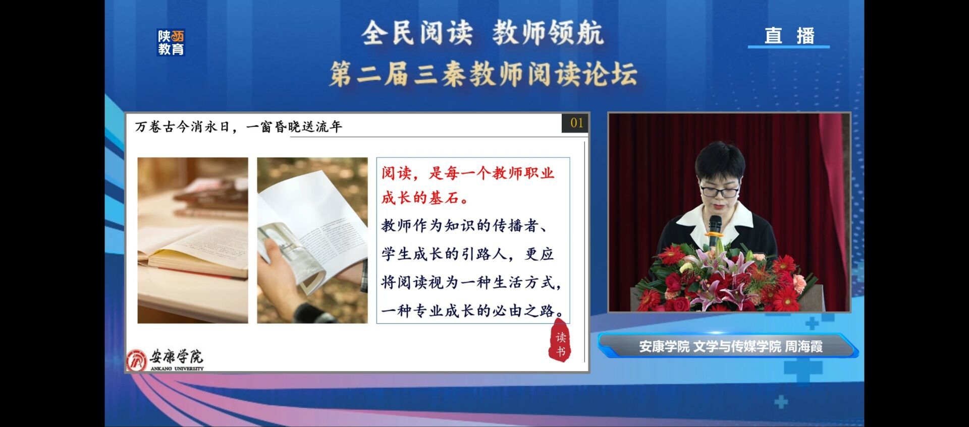 4月27日,由中共陕西省委教育工委和陕西省教育厅指导的“全民阅读 教师领航·第二届三秦教师阅读论坛”陕南专场在安康市第一小学隆重举行。该论坛由陕西学前师范公司与陕西教育报刊社共同主办,伟德国际1949和陕西省中小学幼儿园教师发展中心共同协办。论坛旨在展现陕西教师群体阅读经验,分享陕西教育阅读工作经验智慧,弘扬践行“教育家精神”,引领全省中小学教师争做新时代好老师,为推动全民阅读凝聚三秦教师群体力量。来自西安、延安、汉中、安康的9名专家在论坛现场做了专题分享报告,安康市六百余名中小学教师现场参会学习,两万余名教师线上观看同步直播。