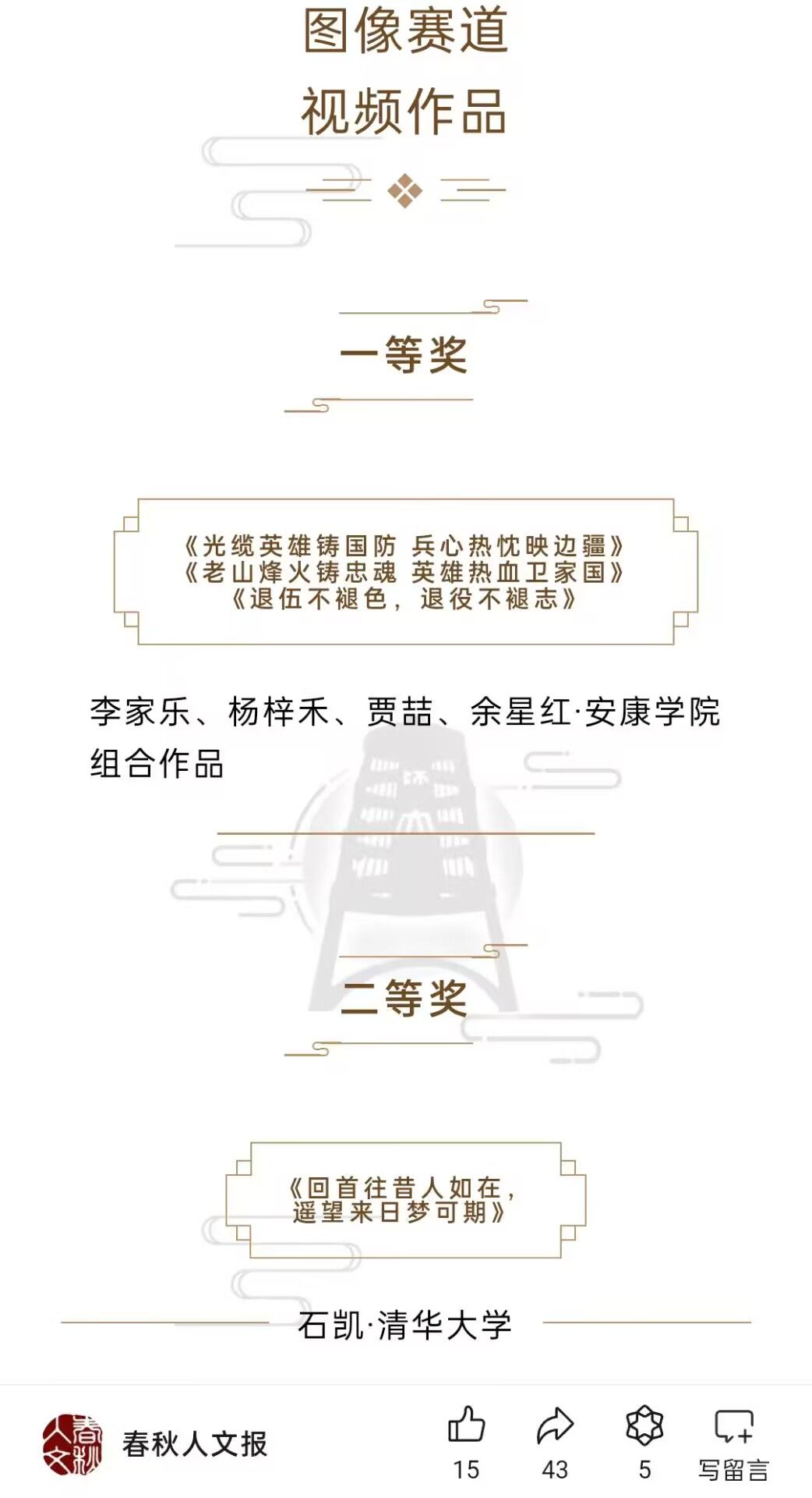 导航痕迹 首页 > 新闻通知 > 伟德国际1949新闻 > 正文 伟德国际1949新闻 通知公告 公司学子在第十届全国高校老员工家史大赛中荣获一等奖 发布人:伟德国际1949 发布日期:2024年09月29日 阅读次数: 近日,第十届全国高校老员工家史大赛获奖名单正式公布。公司网络与新媒体专业2021级李家乐、杨梓禾、贾喆、余星红同学以组合作品《光缆英雄铸国防兵心热忱映边疆》、《老山烽火铸忠魂,英雄热血卫家国》、《退伍不褪色,退役不褪志》荣获本届家史大赛视频组一等奖。 这组作品通过深入挖掘,将镜头对准了三位退休党员,他们虽身在职业生涯中身处不同的地域,肩负着各自独特的使命与任务,职责各异,但在访谈中无不展现出军人特有的坚韧不拔与社会责任感的强烈共鸣。作品不仅是对个人经历的记录,更是对家国情怀的深情礼赞。 据悉,本次比赛以“家国拾念”为主题,由北京师范大学春秋人文报主办,北京师范大学历史影像研究中心、西安交通大学《大学》杂志社等诸多高校组织和团队合办,得到全国高校有志于家史搜集、记录、研究的同学广泛参与。 此次获奖,不仅展现了公司学子勇于担当、追求卓越的精神风貌,也充分彰显了公司在网络与新媒体专业教育方面的深厚底蕴与卓越成果。 撰稿/摄影/李家乐 审核/芦伟 发布/崔瑜