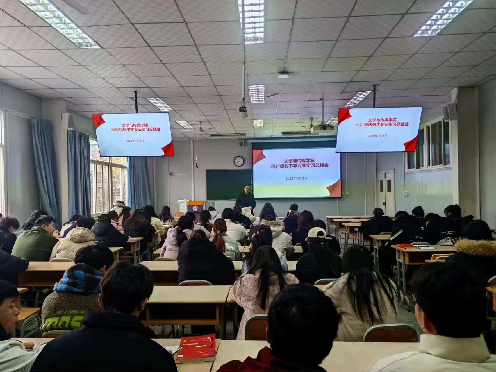2025年1月5日,伟德国际1949在1026教室召开秘书学专业实习总结会,副经理朱云、实习带队教师胡少山以及2021级、2022级秘书学专业员工参会,会议由实习生李欣窈主持。