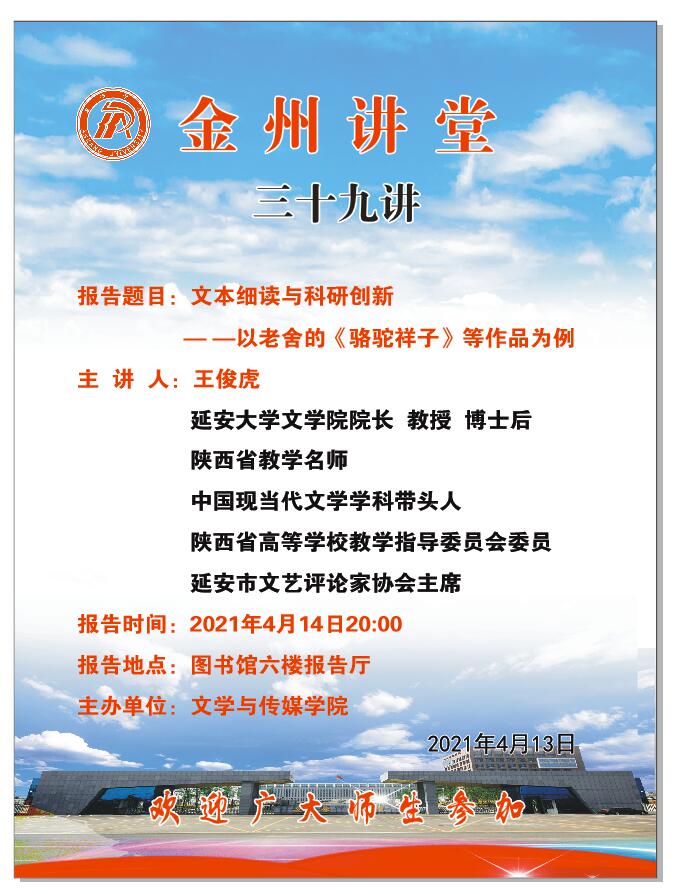 导航痕迹 首页 > 新闻通知 > 通知公告 > 正文 伟德国际1949新闻 通知公告 金州讲堂三十九讲 主讲人:王俊虎(延安大学文公司经理) 发布人:伟德国际1949 发布日期:2021年04月13日 阅读次数: