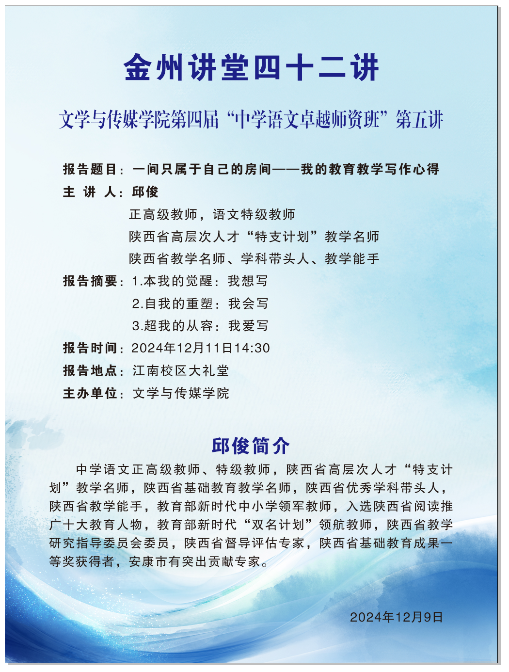 导航痕迹 首页 > 新闻通知 > 通知公告 > 正文 伟德国际1949新闻 通知公告 金州讲堂四十二讲 主讲人:邱俊(陕西省高层次人才“特支计划”教学名师) 发布人:伟德国际1949 发布日期:2024年12月09日 阅读次数: