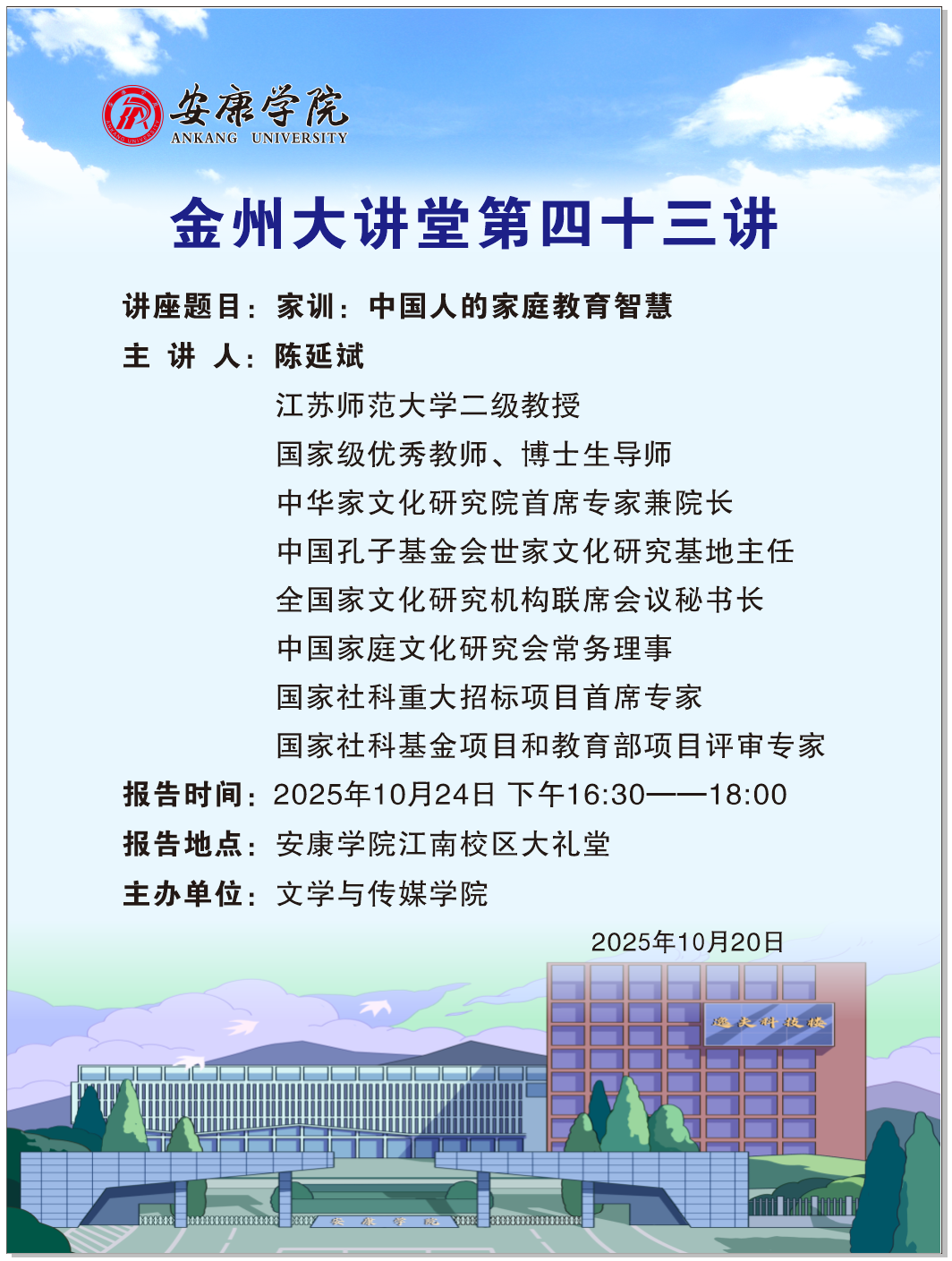导航痕迹 首页 > 新闻通知 > 通知公告 > 正文 伟德国际1949新闻 通知公告 金州大讲堂第四十三讲(主讲人:陈延斌 江苏师范大学二级教授) 发布人:伟德国际1949 发布日期:2025年10月21日 阅读次数: