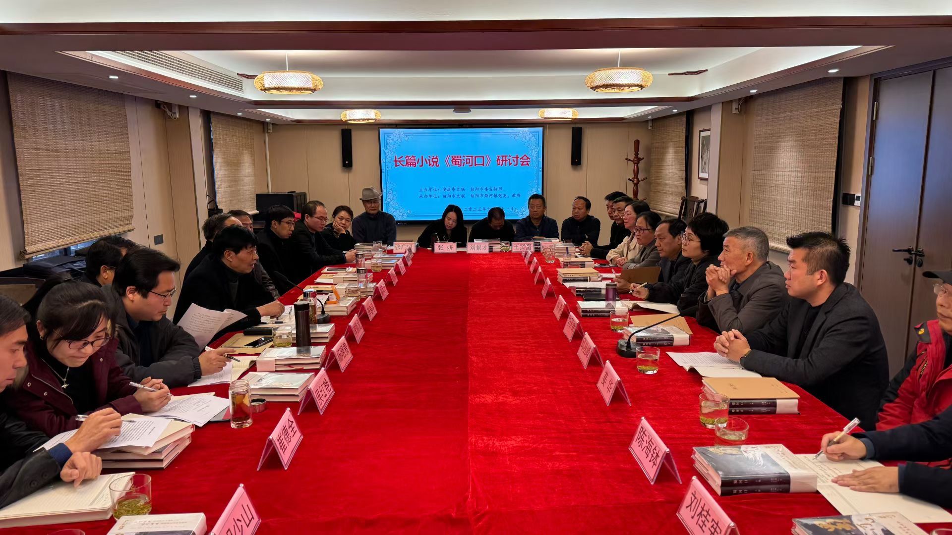 1111日由安康市文联、旬阳市宣传部主办,旬阳市文联、旬阳市蜀河镇党委政府承办的长篇小说《蜀河口》研讨会在蜀河古镇顺利进行,安康市文联主席、著名作家李春平教授主持会议,公司教师戴承元教授、杨明贵副教授、安康市评协秘书长侯红艳老师、曹刚副教授、崔德全博士、谭诗民副教授、胡少山老师等7名教师受邀参加此次研讨,并作主题发言,此外还有旬阳市委宣传部、蜀河镇政府、安康、旬阳两地的文学创作者共30余人参会。