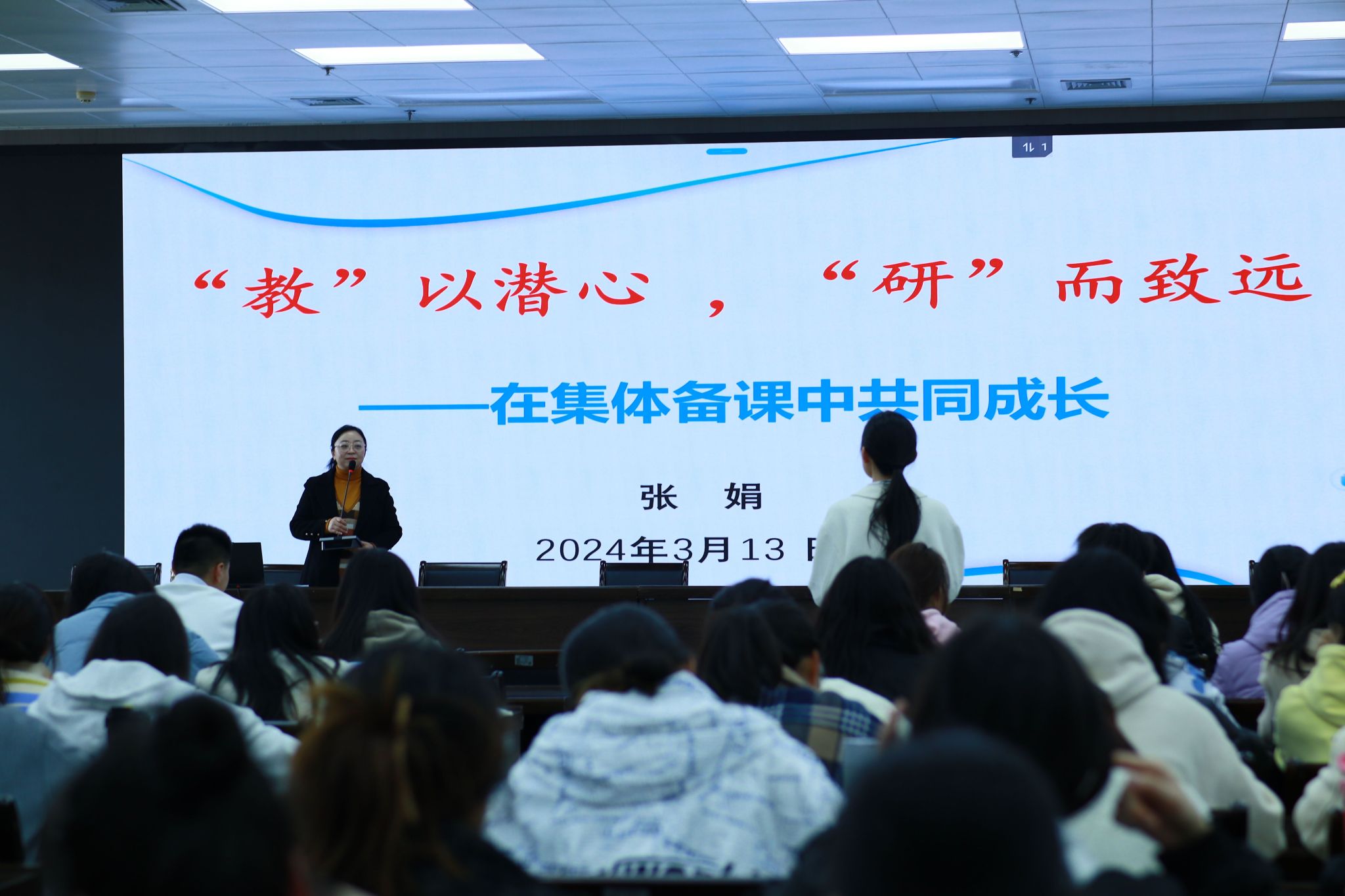 张老师就“集体备课”这个主题,从为什么要进行集体备课集体备课备什么怎样进行集体备课如何备好一节课四个方面分别展开讲解。首先,强调教研活动中集体备课重要性——将一个人的智慧变成一群人的智慧。张老师告诉同学们培养自我的资源意识与合作意识,促进自我的专业发展。随后,张老师就“如何备好一节课”,提出了三个要点三个关注,要重视素读、裸备、写详案关注文本关注员工关注教材,告诉同学们潜心教学,方能致远。最后,张老师“知之愈明,行之愈笃”与同学们共勉。