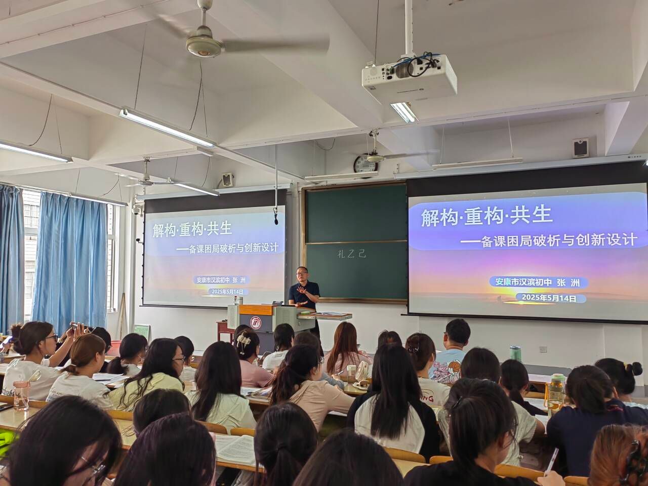 2025年5月14日下午,伟德国际1949在江南校区1510教室举办了《孔乙己》示范课展示及“解构·重构·共生——备课困局破析与创新设计”专题讲座活动。本次活动特邀陕西省教学能手、汉滨初级中学张洲老师主讲,班主任唐明珍和第四届“中学语文卓越团队班”全体学员及部分毕业生共同参与。