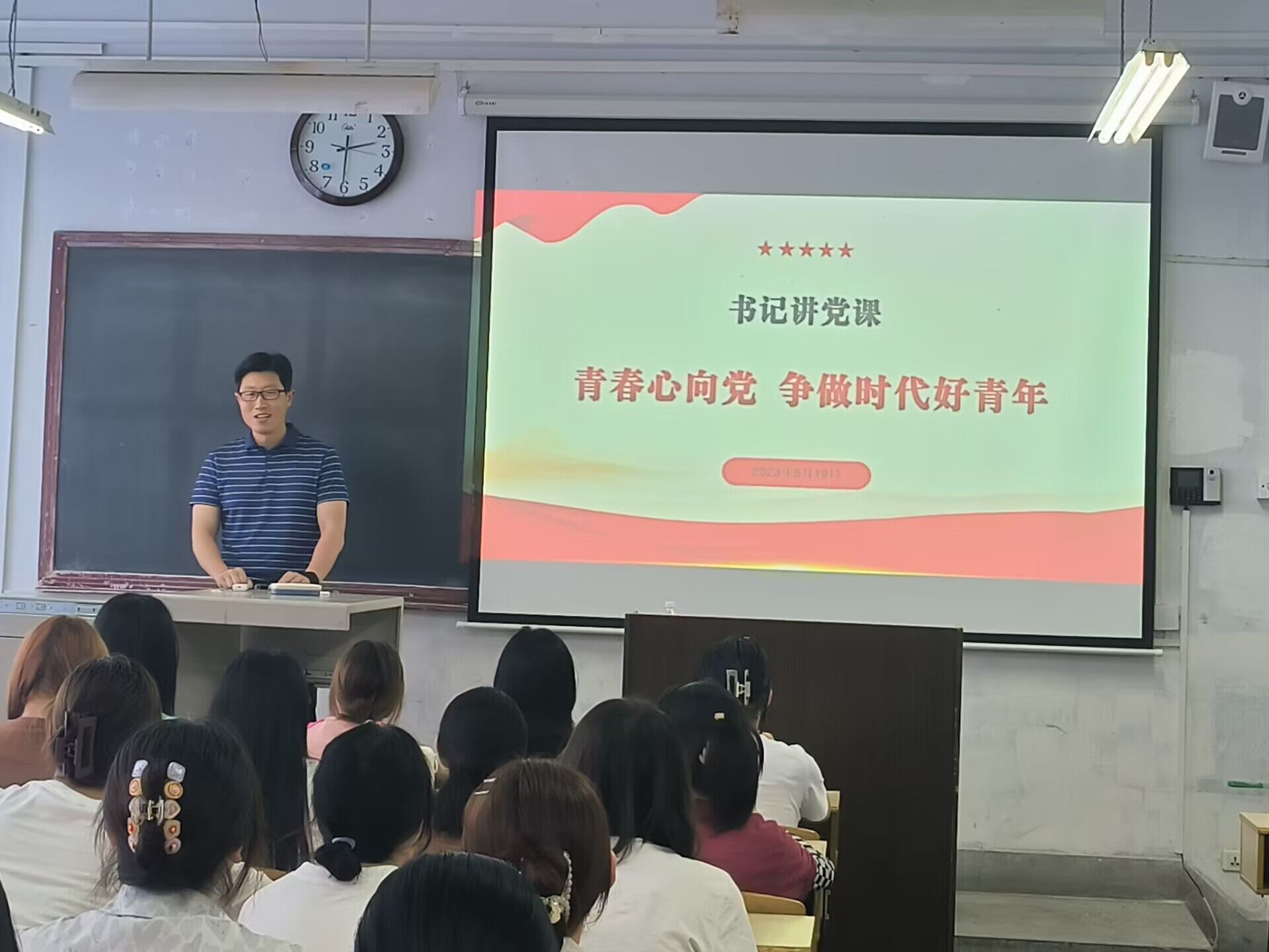 为了推进学习贯彻党的二十大精神和习近平新时代中国特色社会主义思想向下延伸,提高青年员工的思想认识和爱国爱党爱社会主义情怀、增强历史使命担当和责任感,引领青年老员工与新时代同呼吸共命运,2023年5月19日下午,公司党总支书记芦伟深入2022级汉语言文学4班,以“青春心向党,争做时代好青年”为题为员工们讲党课。