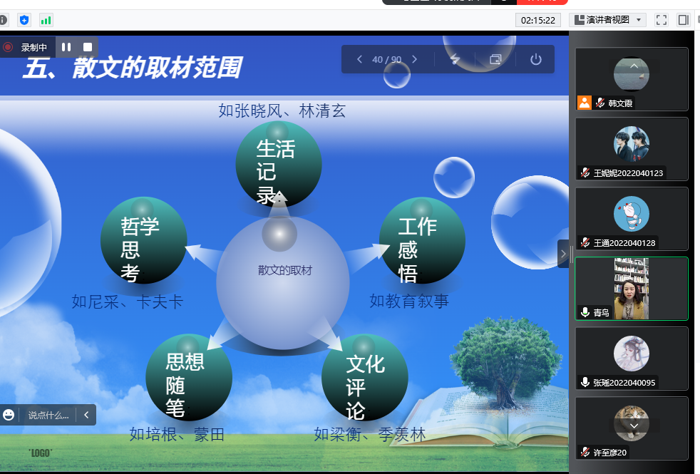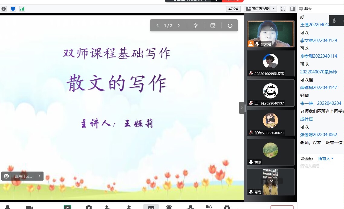 12月7日下午,作家王娅莉应伟德国际1949邀请,通过腾讯会议与基础写作课校内教师韩文霞、曹刚一同为汉语言文学专业2022级员工讲授“散文创作”。