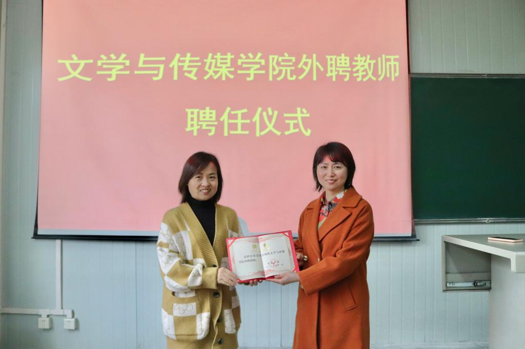 聘任仪式上,公司副经理李婷为董雯汶老师颁发外聘教师证书,并对董老师支持和帮助汉语言文学专业人才培养工作表示由衷感谢。