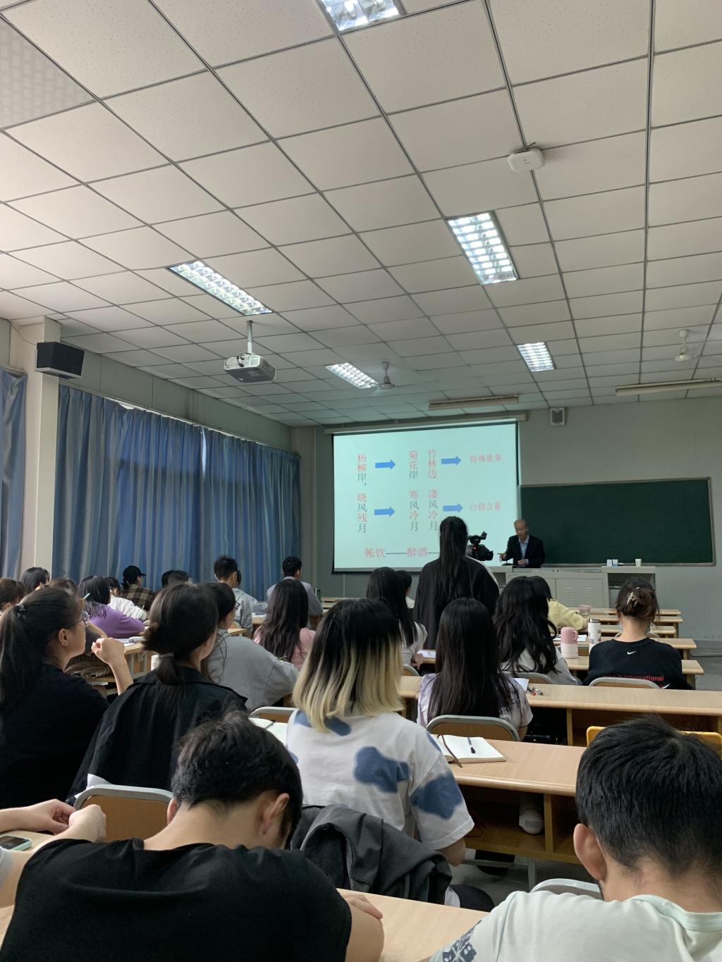 本场活动由三个环节组成。第一环节是微课教学展示。程老师以“杨柳岸,晓风残月”一句的赏析为例,带领团队班的同学们一起重新领略了高中时代古诗词课的魅力。第二环节,程时进老师做了题为《阅读古典诗歌的一般程序》的微讲座,程老师结合大量生动鲜明的课例给同学们传授了五个具体实用的方法:一是判明诗体,二是立足整体读懂诗句,三是入境悟境,四是知人论世,五是分析写法。活动第三环节是互动交流,团队班的同学们踊跃发言,向程老师提出了有关诗词教学的相关问题,程老师一一做了解答,与此同时,程老师还向同学们推荐了相关阅读书目。