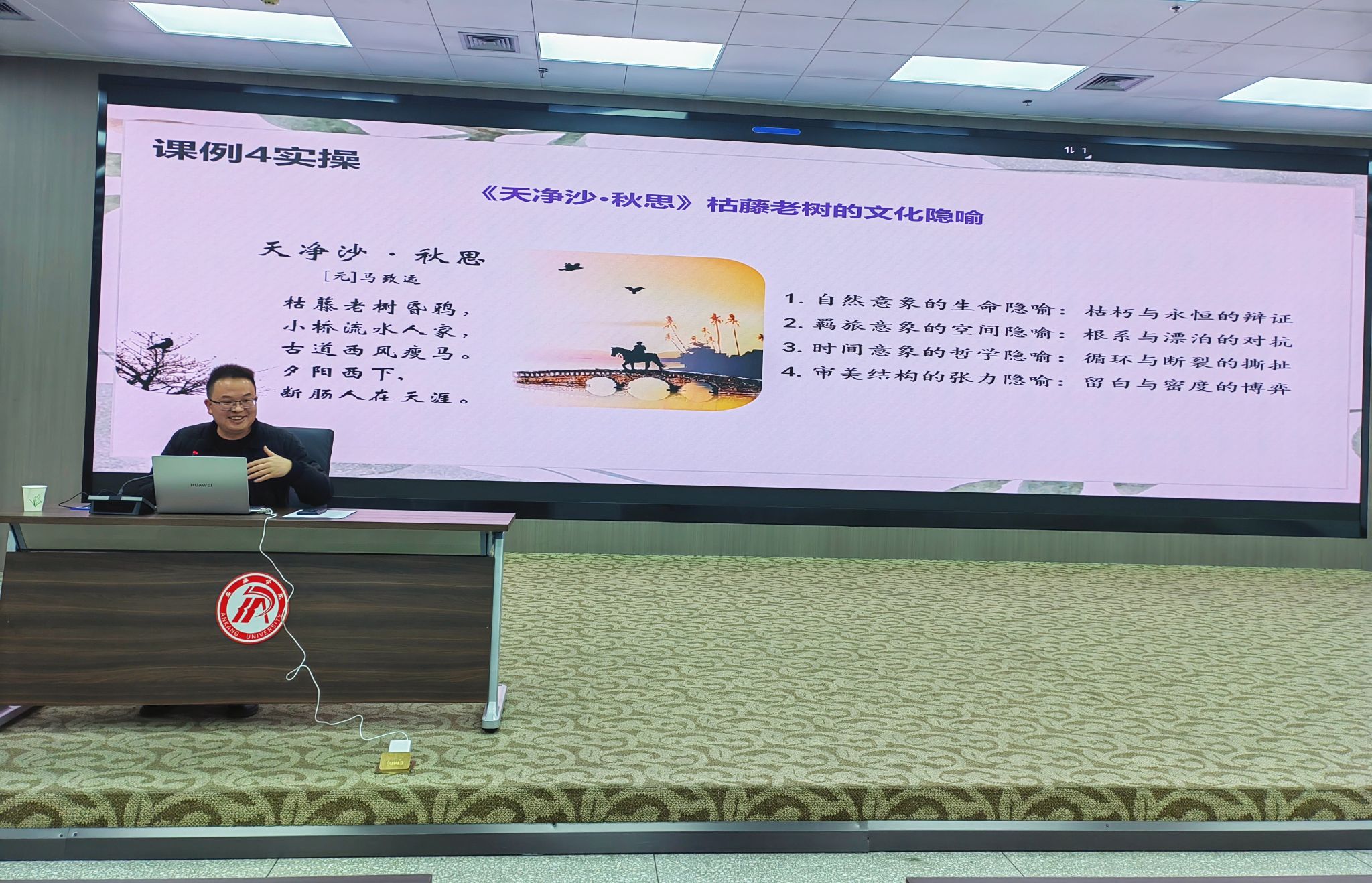 针对这些困境,吴老师结合具体课例,从 “文字层”“文学层” 和 “文化层” 三个阶梯展开,详细阐述了文本解读逻辑,即解码语言符号系统、解析文本创作密码、解悟人文精神内核。随后,吴老师设置了“以《诫子书》为例,采用三阶模型进行教学设计”的实战演练,与同学们进行了互动,引导同学深入思考,补充了同学们在实践方面经验的不足。吴老师还强调,文本解读不仅仅是为了理解文本,更重要的是要将解读成果转化为教学设计,实现从解读到设计的思维转化。真正优质的文本解读,应当让经典穿透时空,如同一束光,照亮员工的眼睛,也能丰盈教师的心灵。