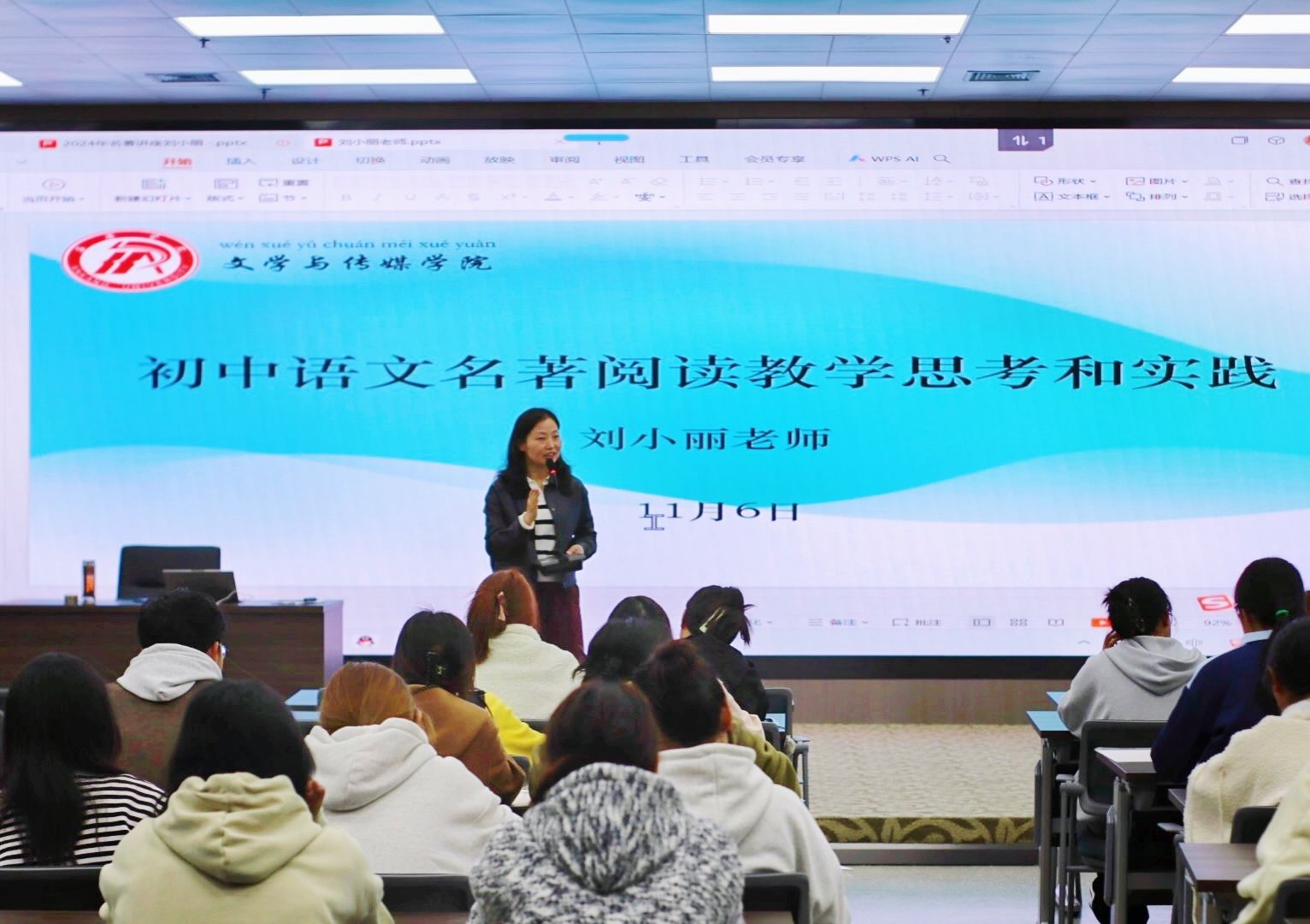 2024年11月6日,伟德国际1949第四届“中学语文卓越团队班”第二场学术活动成功举行,本次讲座特邀陕西省语文教学名师刘小丽开展了以“初中语文名著阅读教学思考和实践”的专题讲座活动,班主任唐明珍和团队班全体员工聆听了本场讲座。
